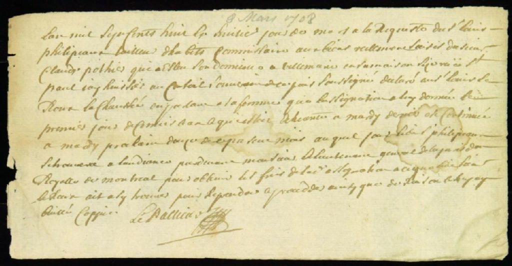 - Ce dossier de matière civile est composé des pièces suivantes : la transcription scellée d'un jugement par défaut contre Claude Pothier et Charles Milot, en faveur de Charles de Couagne ; le rapport de signification de la sentence à Milot et Pothier, à la requête de Guillaume Delort, marchand, procureur de Pierre Peire, Augustin Tréhet et Martin Delisle ; le procès-verbal de la saisie réelle d'une maison appartenant à Pothier sur la rue Saint-Paul et d'une autre sur la rue Saint-Joseph ainsi que d'une concession et de maisons de pierre à Lachine ; les divers rapports d'affiches ; le cahier des criées à Lachine et Ville-Marie ; leur certification par Jean Cusson et Cabezier ; la comparution au greffe de Jean-Baptiste Pothier, notaire, opposant, pour non payement d'hypothèques ; la requête de Delort pour faire certifier les criées ; l'ordre de faire rapport de criées ; la signification à Pothier et Milot, à la requête de Louis Philippeau, tailleur d'habits, pour l'adjudication de baux judiciaires des maisons saisies ; la remise d'adjudications ; et les comparutions de Michel Lepailleur, huissier, pour la mise à prix de la maison de Pothier sur la rue Saint-Paul pour 80 livres et de Charles de Couagne, en tant qu¿enchérisseur, pour la maison de Pothier à 90 livres par an.Le dossier comporte aussi les pièces suivantes : l'acte d'arrivée de Pierre Peire au greffe de Montréal, protestant contre de Couagne pour les frais encourus ; la saisie des biens de Charles Milot ; le procès-verbal des criées du 28 juin au 14 août 1705 ; les enregistrements de plusieurs procès-verbaux de comparution d'opposants au greffe ; les diverses comparutions d'enchérisseurs ; l'ordre de procéder à la vente par adjudication au plus offrant ; la comparution des soeurs de la Congrégation, en tant qu'opposantes sur les biens de Pothier ; la transcription de la sentence d'adjudication à Jacques Thibierge, armurier du roi, agissant pour un dénommé Jean-Claude Pothier ; l'opposition de Jean Soumande, marchand bourgeois ; la requête de Louis Philippeau, commissaire établi, pour récupérer 12 livres de loyer par Delort ; les assignations ; le jugement pour Louis Philippeau contre Maurice Blondeau, pour le payement du loyer judiciaire et sa signification.Le dossier contient également les pièces suivantes : la signification d'une sentence à Louis Leroux dit Lachaussée, époux de Catherine Boivin, opposant ; la comparution de mère Charlotte Gallard, supérieure des religieuses de l'Hôtel-Dieu, et de dame Marie Morin, religieuse dépositaire du bureau des pauvres de Montréal, en tant qu'opposantes sur la distribution des deniers de la vente des maisons et terres de Claude Pothier, pour arrérages de cens et rentes ; la mise à prix de la maison, de la cour et du jardin par Thomas de Joncaire, officier de marine, pour la somme de 2000 livres ; la requête des demandeurs pour procéder à la criée, vu les irrégularités commises par Thibierge ; la permission accordée ; la comparution au greffe de Jacques Thibierge, lequel se désiste de ses prétentions ; la surenchère de Pierre You, sieur de LaDécouverte, officier ; la requête de Jean Cusson, procureur de la succession de Charles de Couagne, pour la criée de l'emplacement ; la transcription d'une sentence pour l'adjudication des biens saisis ; sa signification à Milot et Pothier ; et les affiches.Le dossier comporte enfin : la consignation de 615 livres par le sieur Louis Leroux, pour le prix de l'adjudication ; la requête de Claude Dudevoir pour la protection du douaire de Marie Pothier, épouse de Milot ; la requête de soeur Charlotte Gallard et soeur Françoise Godé, dépositaire des biens des pauvres à l'Hôtel-Dieu, certifiant que le sieur Pothier leur doit la somme de 122 livres ; le rapport d'assignations à tous les opposants ; la requête de Thomas de Joncaire, en opposition à la distribution des deniers de la vente ; la copie du certificat de mariage de Pothier et Boisdon à LaRochelle, le 25 novembre 1670 ; la procuration laissée en blanc de Thomas de Joncaire ; l'opposition de Marie Pothier, en tant qu'héritière du douaire de sa mère Louise Boisdon ; la sentence pour la production des pièces justificatives d'ici huitaine par les opposants ; et l'assignation à Jean-Baptiste Bissot, sieur de Vincennes, à la requête de Louis Philippeau, commissaire, pour l'obliger à payer tous les loyers de la maison de Pothier. Les documents mentionnent également Jacques Milot en tant qu¿opposant
