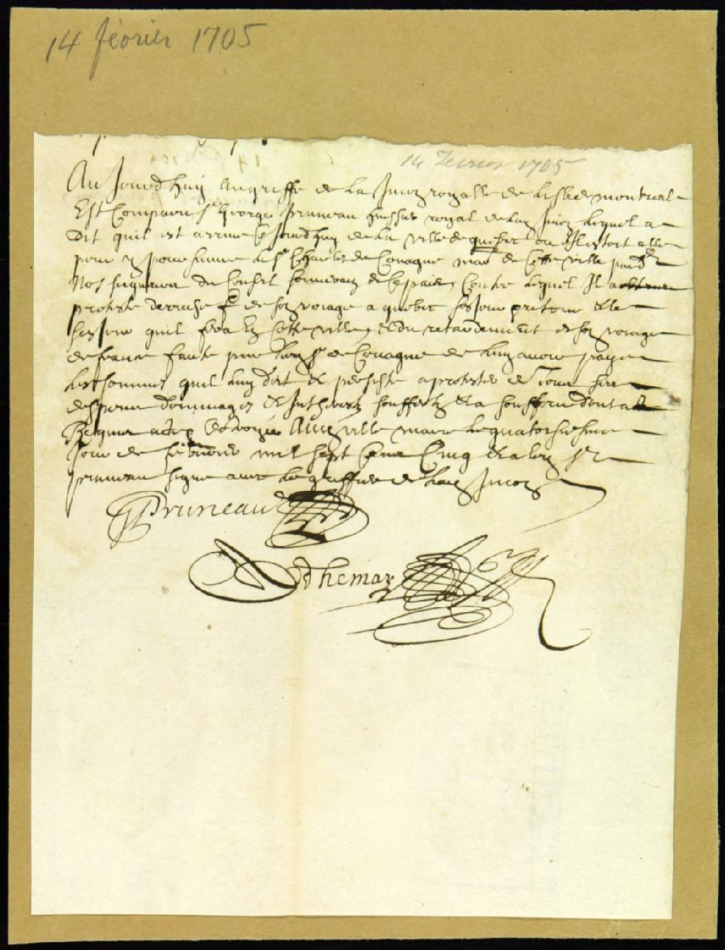 Protestation de Georges Pruneau, huissier, pour les frais encourus lors de son voyage pour aller représenter Charles de Couagne devant le Conseil supérieur à Québec et pour avoir manqué son voyage en France, 14 février 1705, Archives nationales à Montréal, Fonds Juridiction royale de Montréal, (06M,TL4,S1,D810).