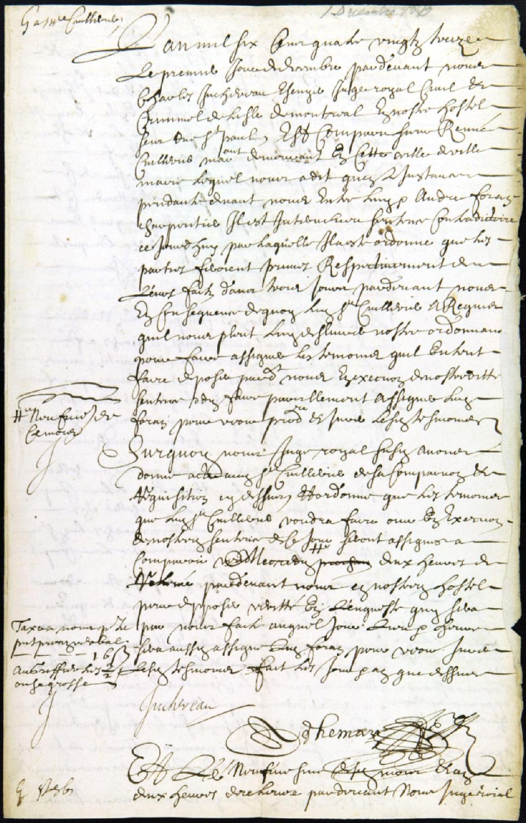 - Procès entre René Cuillerier, marchand de la rue Saint-Paul, demandeur, et André Forand, menuisier, défendeur, au sujet d'ouvrages de charpente faits à la maison du demandeur, suivant un marché passé devant le notaire Adhémar en 1692