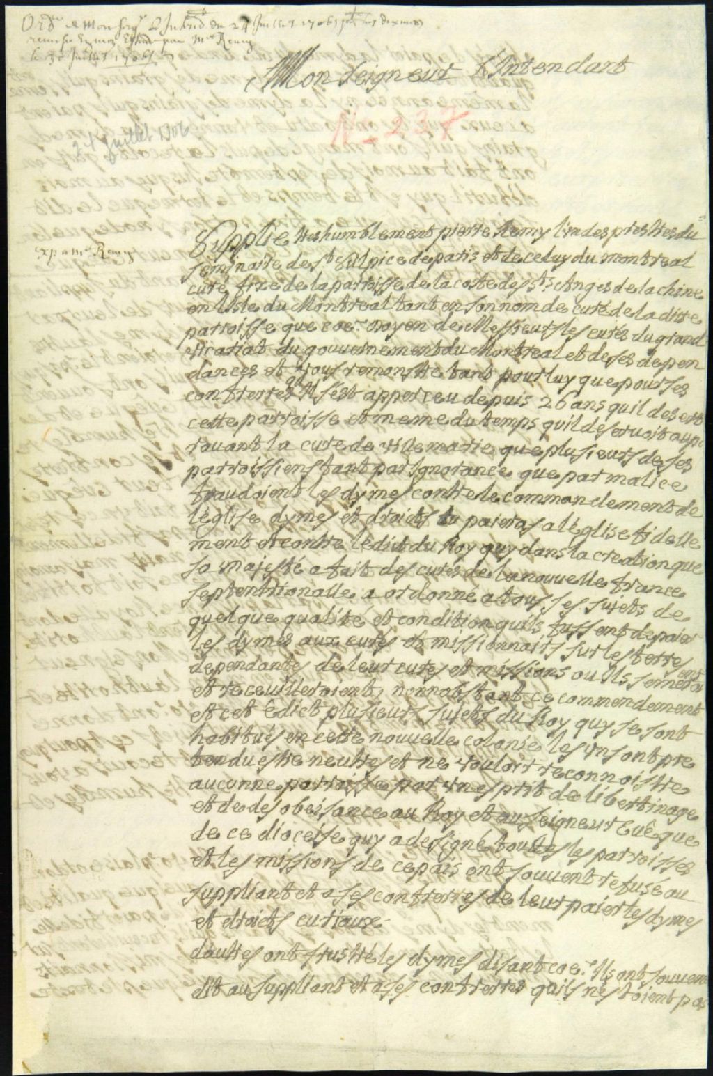 - Ce dossier d'administration civile contient la plainte du curé de Lachine, Pierre Rémy, adressée à l'intendant Raudot, à l'effet que certains paroissiens ne lui payent pas les dîmes sur les grains récoltés et l'ordonnance de l'intendant afin que tous ceux qui exploitent des terres dans la paroisse de Lachine et autres paroisses de ce pays, payent la dîme sur les grains au taux de 1/26. L'ordonnance est lu et publié le 25 juillet 1706 par le curé Rémy. Le dépôt au rang des minutes du notaire Antoine Adhémar complète le dossier