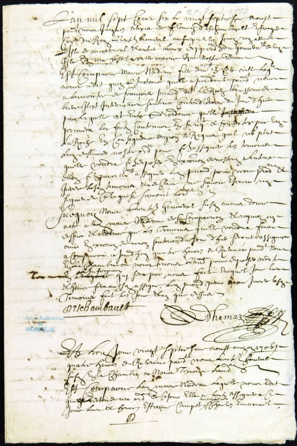 Procès entre Marie Nadeau, plaignante, et François Picard dit Laroche, brasseur de bière, accusé de paroles injurieuses et calomnies, 27 août 1706 - 28 août 1706, Archives nationales à Montréal, Fonds Juridiction royale de Montréal, (06M,TL4,S1,D955).