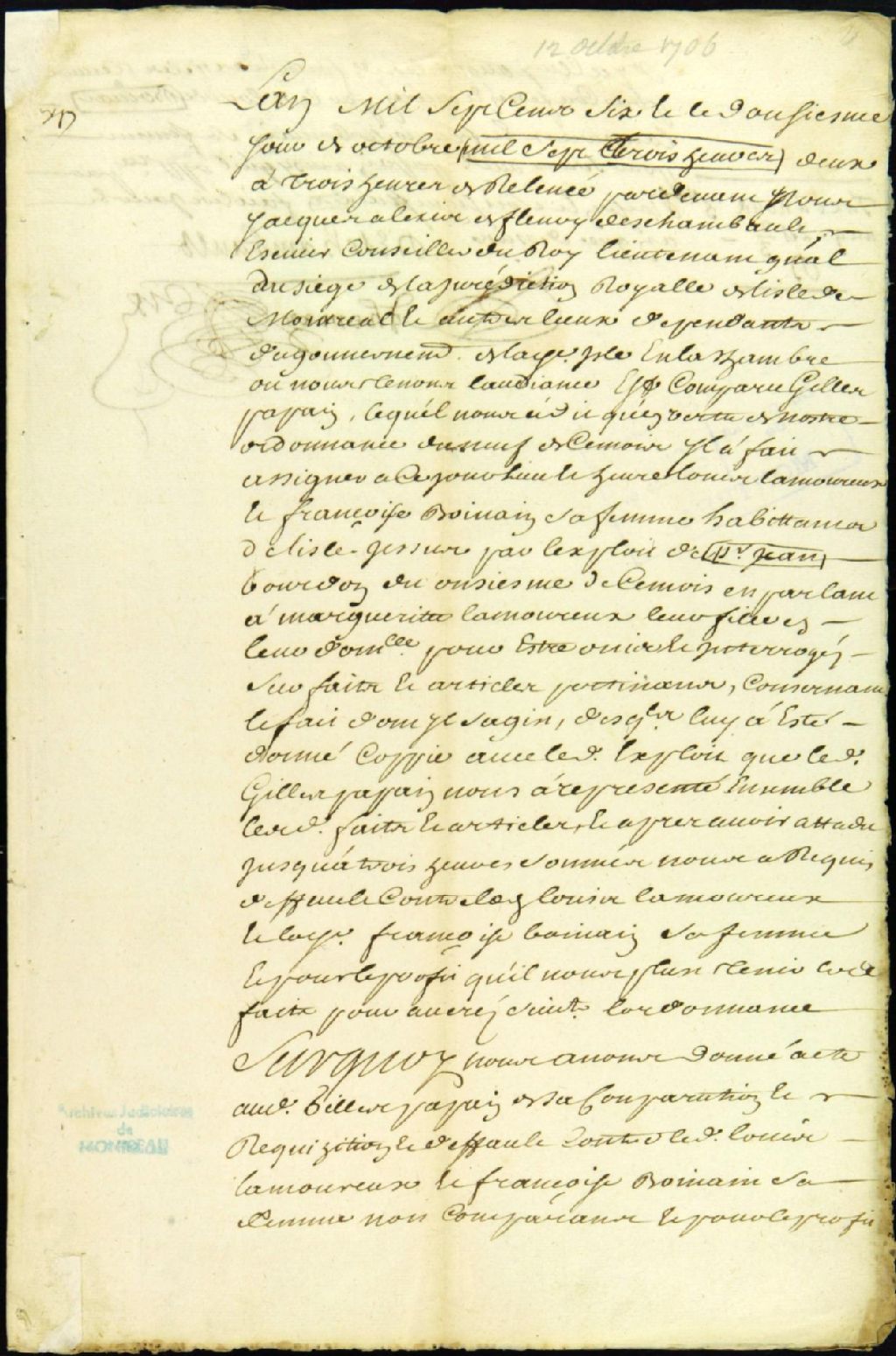 Procès entre Gilles Papin, demandeur, et Louis Lamoureux et sa femme Françoise Boivin, défendeurs