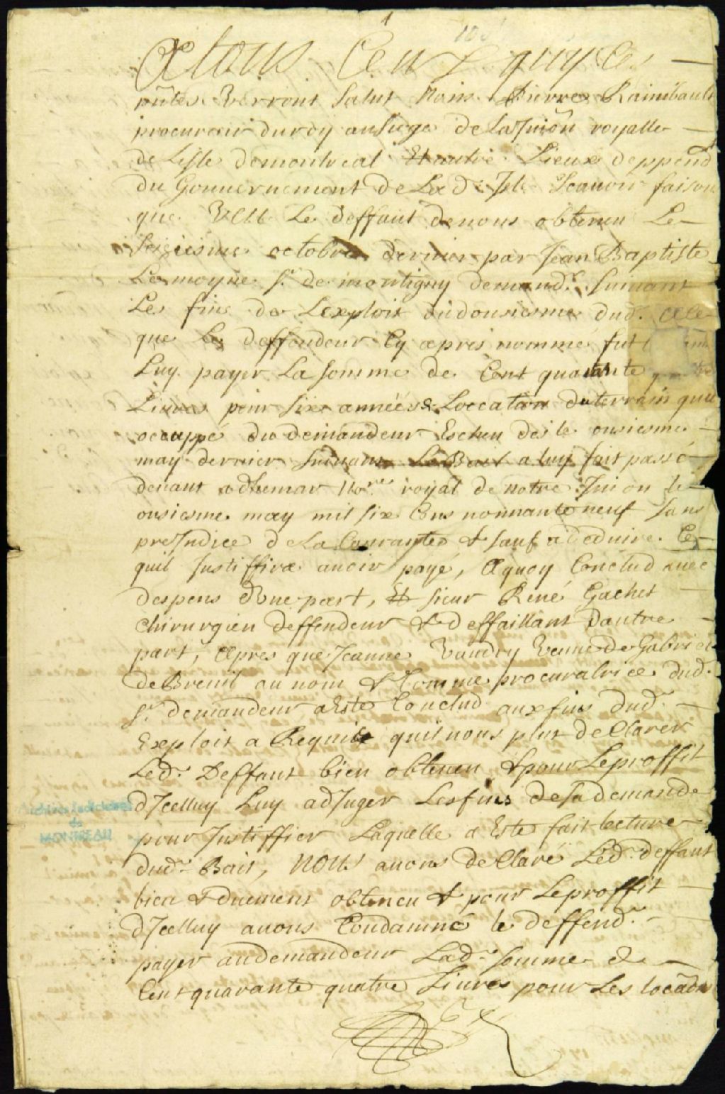 - Procès entre Jean-Baptiste Lemoine, sieur de Martigny, demandeur, et René Gachet, chirurgien, défendeur, pour le paiement de la location d'un terrain dont le bail est échu
