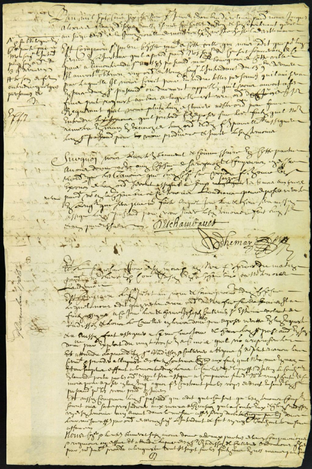 - Ce dossier de matière civile est composé des pièces suivantes : la requête de Pierre Chesne pour faire entendre ses témoins, tel que requis par le Conseil Souverain dans un différend avec le sieur Antoine Pascaud ; l`ordre d'assigner les témoins ; le procès-verbal d'enquête ; l'enquête comprenant la déposition des témoins Étienne Volant, sieur de Radisson et Joseph Cuillerier, lequel demeure chez son père René ; la défaut pour non comparution de Michel-Louis Cavelier ; la signification et l'assignation. L'enquête avec déposition de Michel-Louis Cavelier complète le dossier