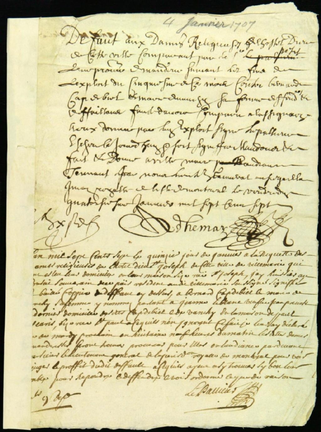 Procès entre Adrien Bétourné dit Laviolette, demandeur, et Bernard Kadeviel et sa femme Marie de Vanchy, défendeurs, pour paiement d'un billet, 5 janvier 1707 - 14 mars 1707, Archives nationales à Montréal, Fonds Juridiction royale de Montréal, (06M,TL4,S1,D988).
