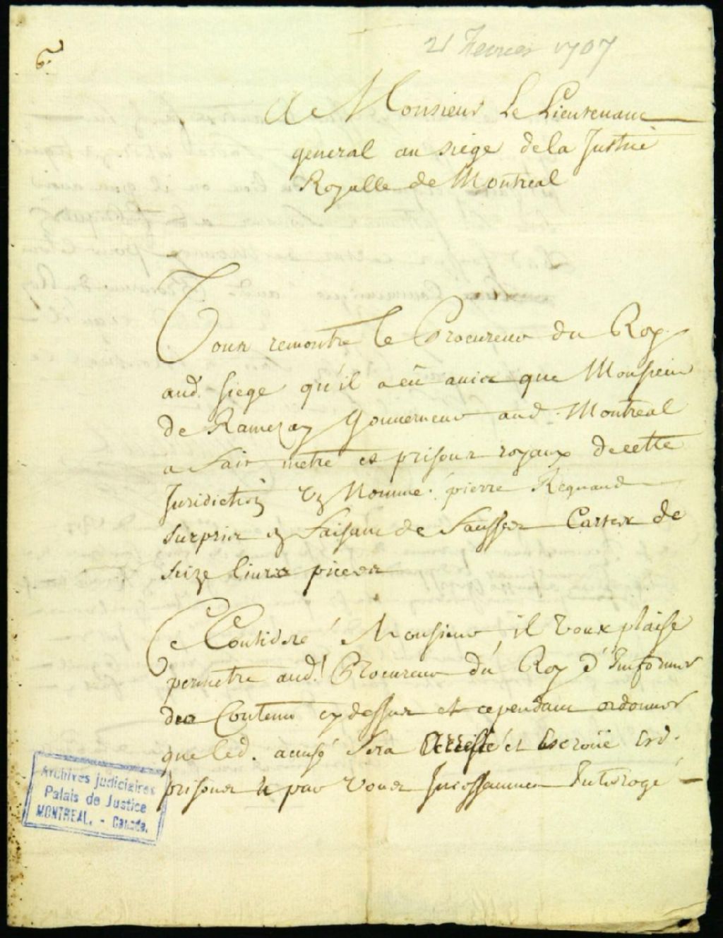 - Ce dossier de matière criminelle est composé des pièces suivantes : la requête contenant la plainte du procureur du roi pour tenir une information judiciaire contre Pierre Regnaud, âgé de 17 ans, domestique de M. de Ramezay, accusé d'avoir fabriqué de la fausse monnaie de carte ; l'octroi de la permission ; l'interrogatoire de l'accusé ; la communication au procureur du roi, lequel requiert l'assignation de Jean Laquoste, 31 ans, perruquier de métier, valet de chambre de Ramezay ; le décret d'assignation à comparaître au même Laquoste ; l'extrait de la conciergerie des prisons de Montréal sur l'écrou de Regnaud ; la signification à l'accusé ; l'interrogatoire de Jean Laquoste et sa communication au procureur du roi ; et l'assignation à comparaître aux autres témoins, notamment à Marie Boutelier, 19 ans, fille de chambre de Ramezay ; à Nicolas Bauve, 20 ans, écrivain du sieur d'Aigremont et à Louis Prévost, 32 ans, cuisinier de Ramezay [...]