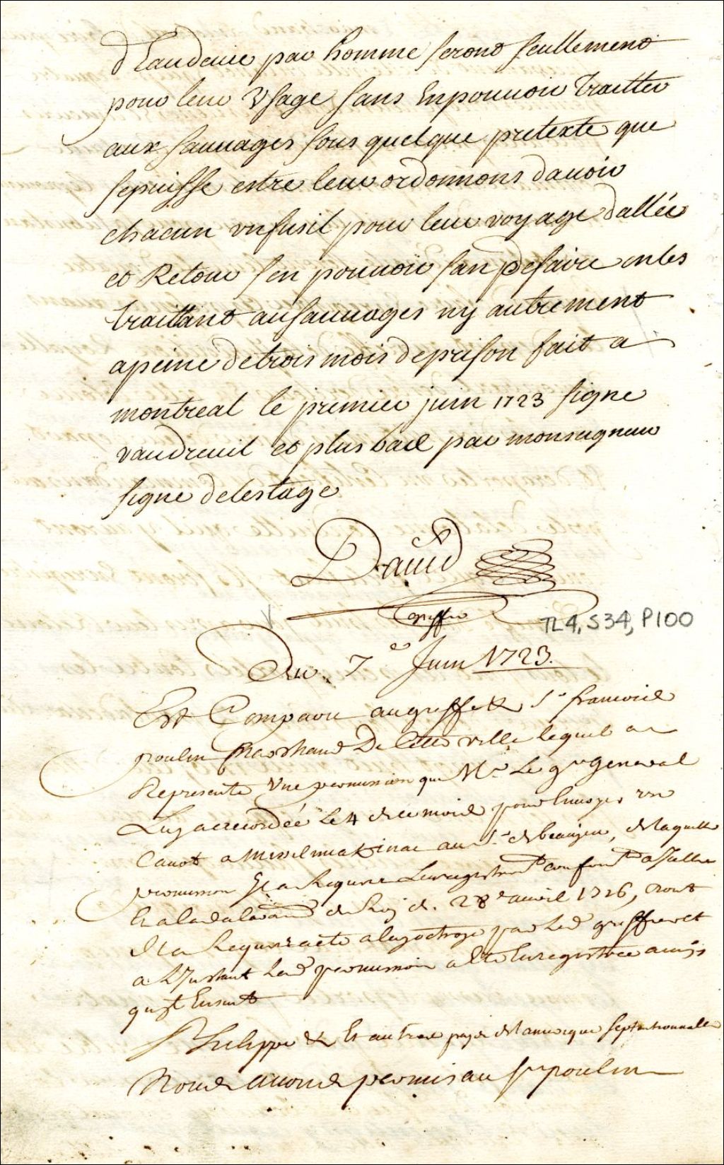Montréal. Enregistrement d'une permission accordée par Philippe Rigaud de Vaudreuil gouverneur de la Nouvelle-France, le 4 juin, à François Poulin de Francheville, d'un canot et quatre hommes, pour porter au capitaine [Louis Liénard] De Beaujeu, commandant au Poste de Michillimakinac, provisions et marchandises, 7 juin 1723, Archives nationales à Montréal, Fonds Juridiction royale de Montréal, (06M,TL4,S34,P100).
