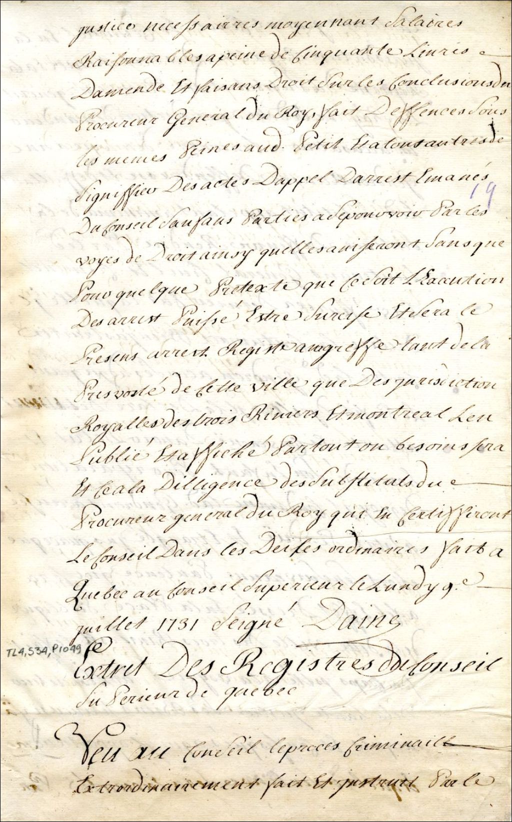 Montréal. Enregistrement d'un extrait des registres du Conseil supérieur de Québec, du 24 mars, portant sur la condamnation à mort de Marie-Anne Gendron accusée d'infanticide., 4 juillet 1732, Archives nationales à Montréal, Fonds Juridiction royale de Montréal, (06M,TL4,S34,P1049).