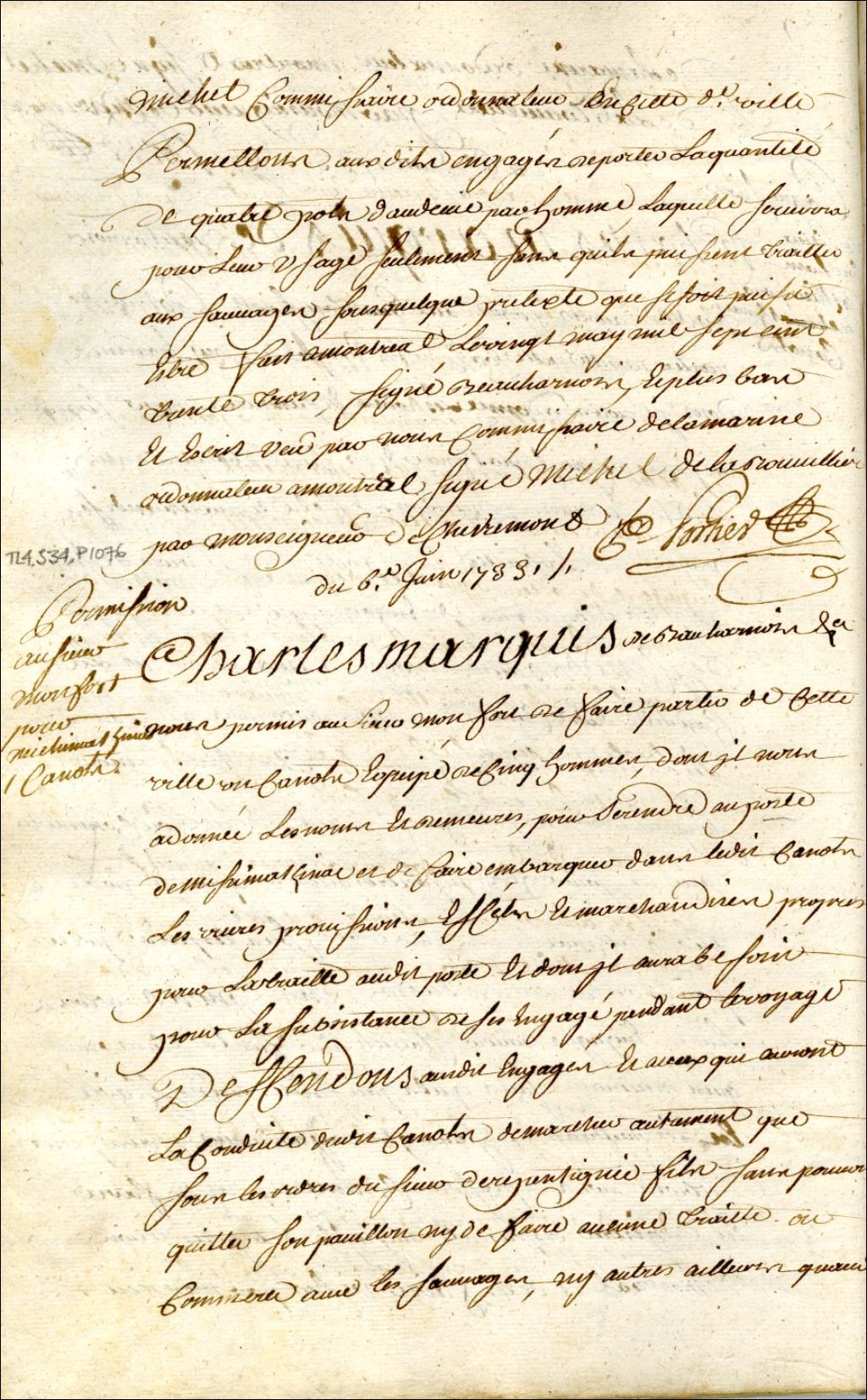 Montréal. Enregistrement d'une permission accordée par Charles de Beauharnois, gouverneur de la Nouvelle-France, le 20 mai, à Montfort, d'un canot et cinq hommes, pour se rendre au Poste de Michillimakinac, 6 juin 1733, Archives nationales à Montréal, Fonds Juridiction royale de Montréal, (06M,TL4,S34,P1076).
