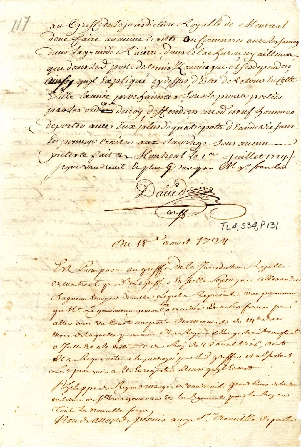 Montréal. Enregistrement d'une permission accordée par Philippe Rigaud de Vaudreuil gouverneur de la Nouvelle-France, le 14 août, à Alexandre Dagneau Douville et ses frères, d'un canot et cinq hommes, lui compris, pour porter au Poste des Miamis et Ouaytanons, des effets à remettre au sieur De Noyelles [Nicolas-Joseph de Noyelles de Fleurimont], 18 août 1724, Archives nationales à Montréal, Fonds Juridiction royale de Montréal, (06M,TL4,S34,P131).