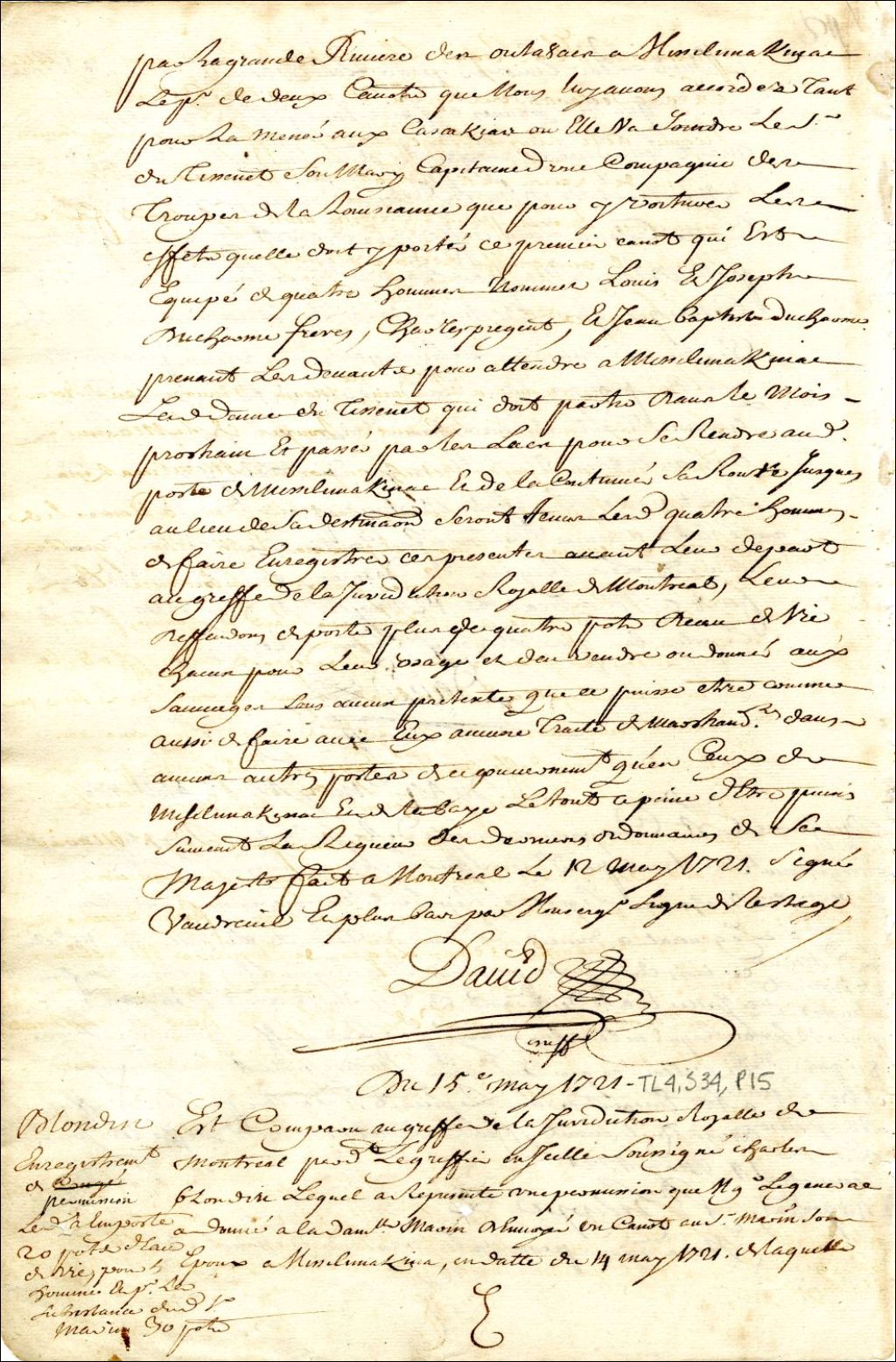 Montréal. Enregistrement d'une permission accordée par Philippe Rigaud de Vaudreuil gouverneur de la Nouvelle-France, le 14 mai à la dame Marin [Marie-Josèphe Guyon Després], d'un canot et quatre hommes, pour envoyer des vivres à son mari, enseigne réformé des troupes de la Marine, au Fort de Michillimakinac, 15 mai 1721, Archives nationales à Montréal, Fonds Juridiction royale de Montréal, (06M,TL4,S34,P15).