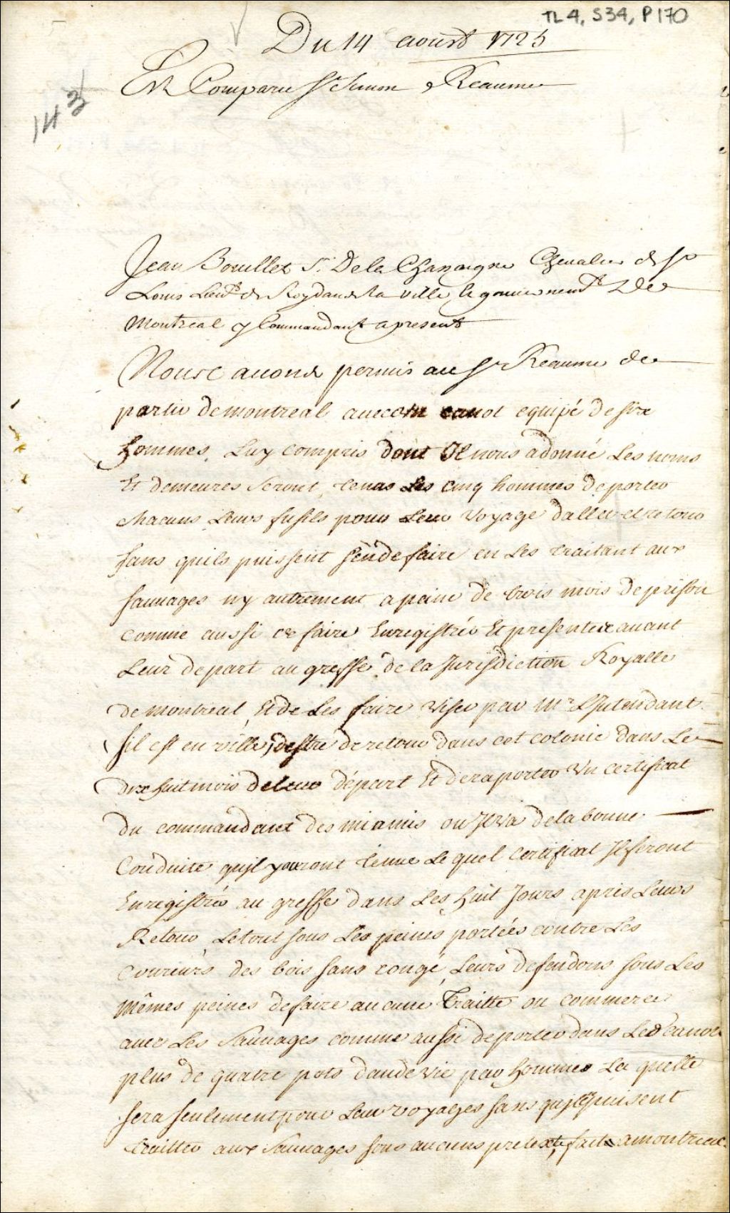 Montréal. Enregistrement d'une permission accordée par Jean Bouillet de La Chassaigne, lieutenant du roi et commandant de Montréal, à Simon Rhéaume, d'un canot et cinq hommes, lui compris, pour aller aux Miamis, 14 août 1725, Archives nationales à Montréal, Fonds Juridiction royale de Montréal, (06M,TL4,S34,P170).