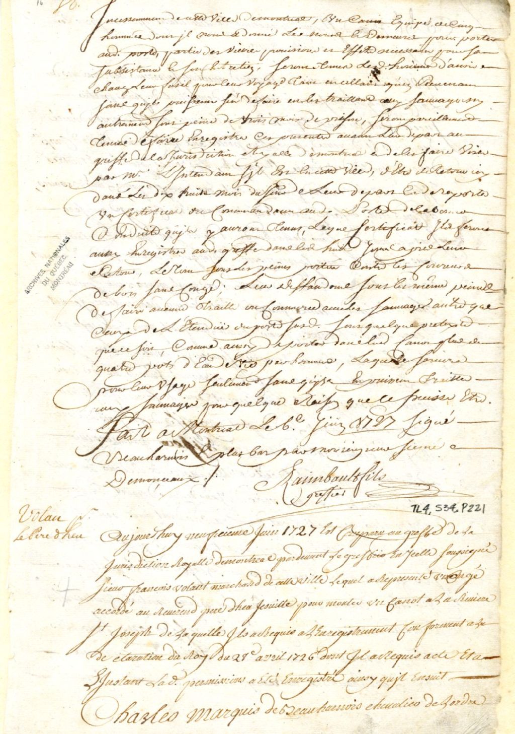 Montréal. Enregistrement d'une permission accordée par Charles de Beauharnois, gouverneur de la Nouvelle-France, le 6 juin, au père Dheu [Jacques d'Heu], supérieur des missions de la Compagnie de Jésus à Montréal, d'un canot et cinq hommes, pour porter aux missionnaires du Poste de la Rivière St-Joseph, des provisions, 9 juin 1727, Archives nationales à Montréal, Fonds Juridiction royale de Montréal, (06M,TL4,S34,P221).