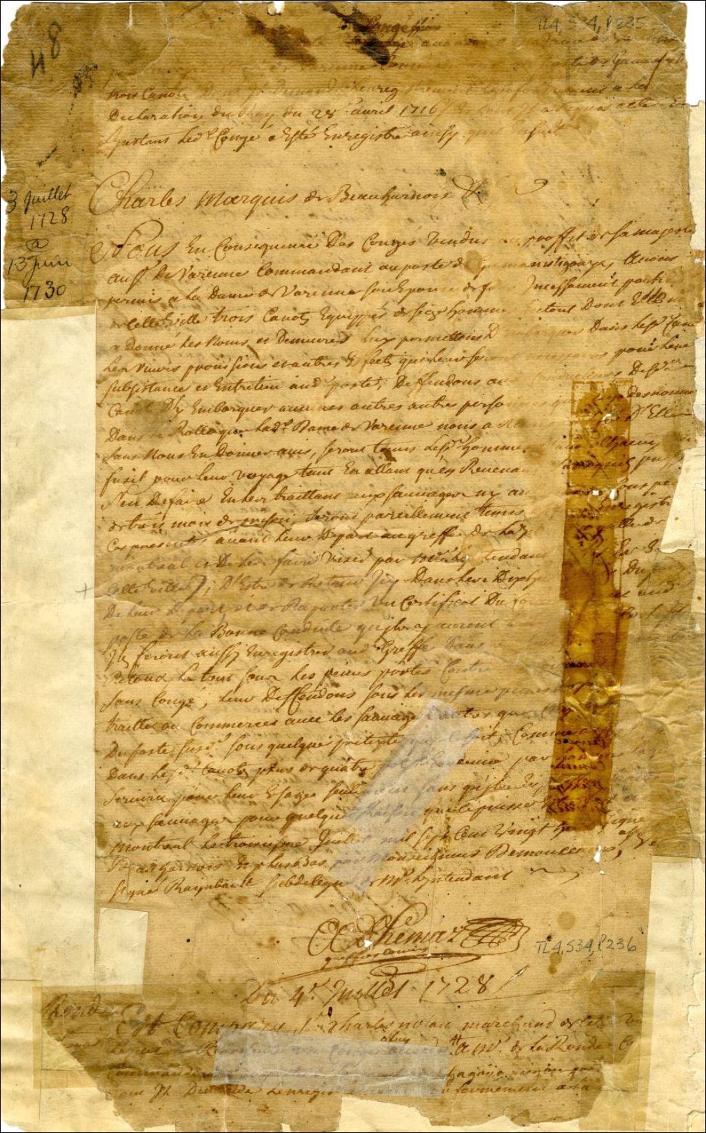Montréal. Enregistrement d'une permission accordée par Charles de Beauharnois, gouverneur de la Nouvelle-France, le 3 juillet, au capitaine De Laronde [Louis Denys de La Ronde], commandant au Poste de la Pointe de Chagouamigon, de quatre canots et vingt hommes, pour se rendre au poste, 4 juillet 1728, Archives nationales à Montréal, Fonds Juridiction royale de Montréal, (06M,TL4,S34,P236).