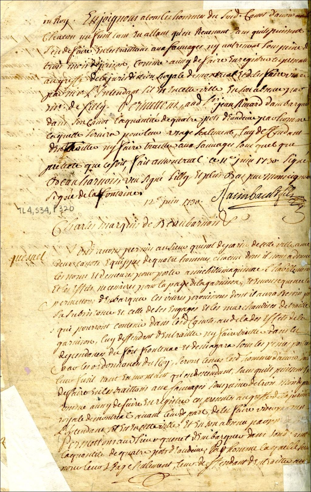Montréal. Enregistrement d'une permission accordée par Charles de Beauharnois, gouverneur de la Nouvelle-France, à Quesnel, deux canots et huit hommes, pour porter à Michillimakinac l'habillement et les effets nécessaires pour la paie de la garnison, 12 juin 1730, Archives nationales à Montréal, Fonds Juridiction royale de Montréal, (06M,TL4,S34,P320).