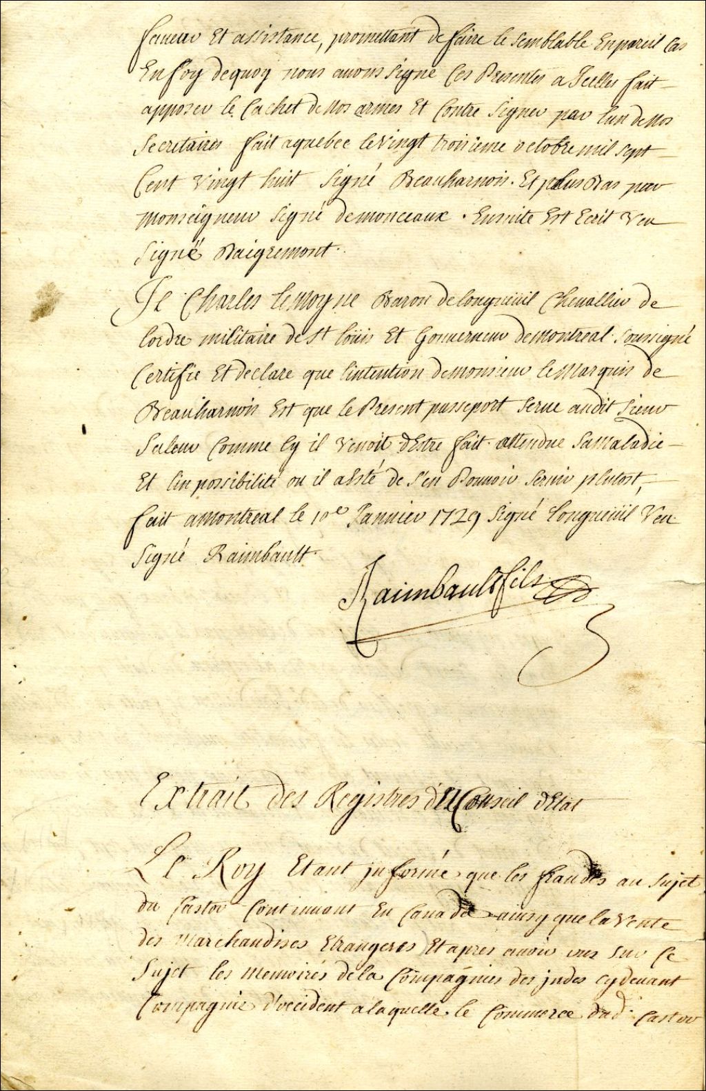 Montréal. Enregistrement d'un extrait des Registres du Conseil d'État du roi du 4 juin 1719, concernant le commerce du castor et la vente de marchandises étrangères