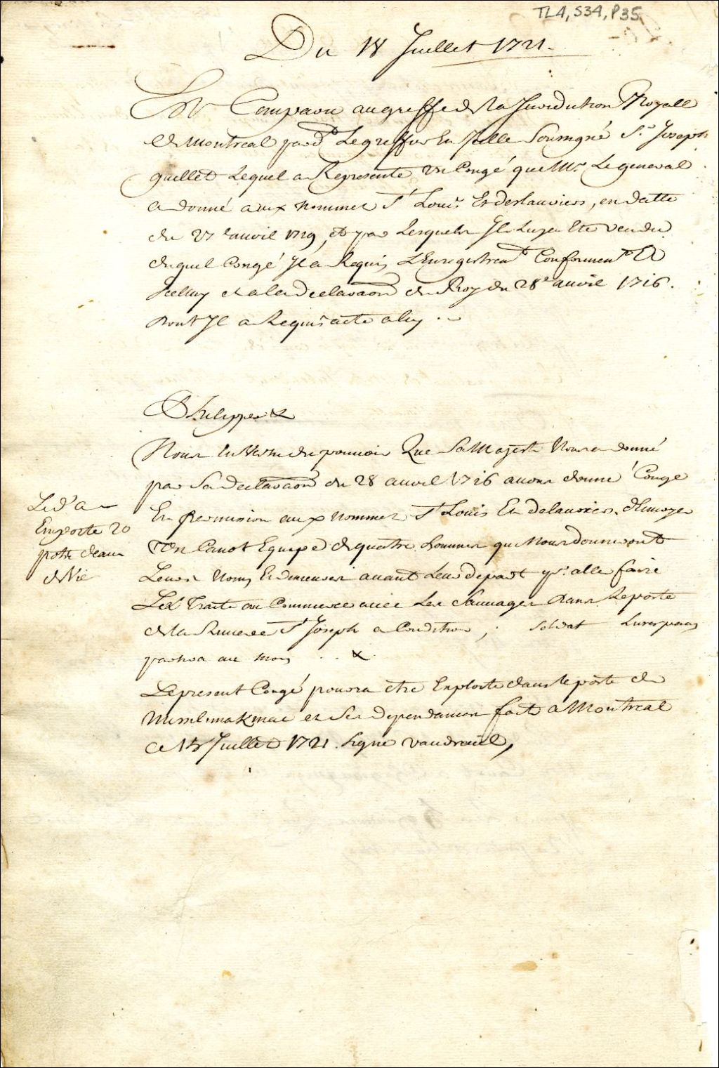 Montréal. Enregistrement d'un congé accordé par Philippe Rigaud de Vaudreuil gouverneur de la Nouvelle-France, le 15 juin 1721,à St-Louis et à Deslauriers, d'un canot et quatre hommes, pour aller faire la traite au Poste de la Rivière St-Joseph et à Michillimakinac, 17 juillet 1721, Archives nationales à Montréal, Fonds Juridiction royale de Montréal, (06M,TL4,S34,P35).