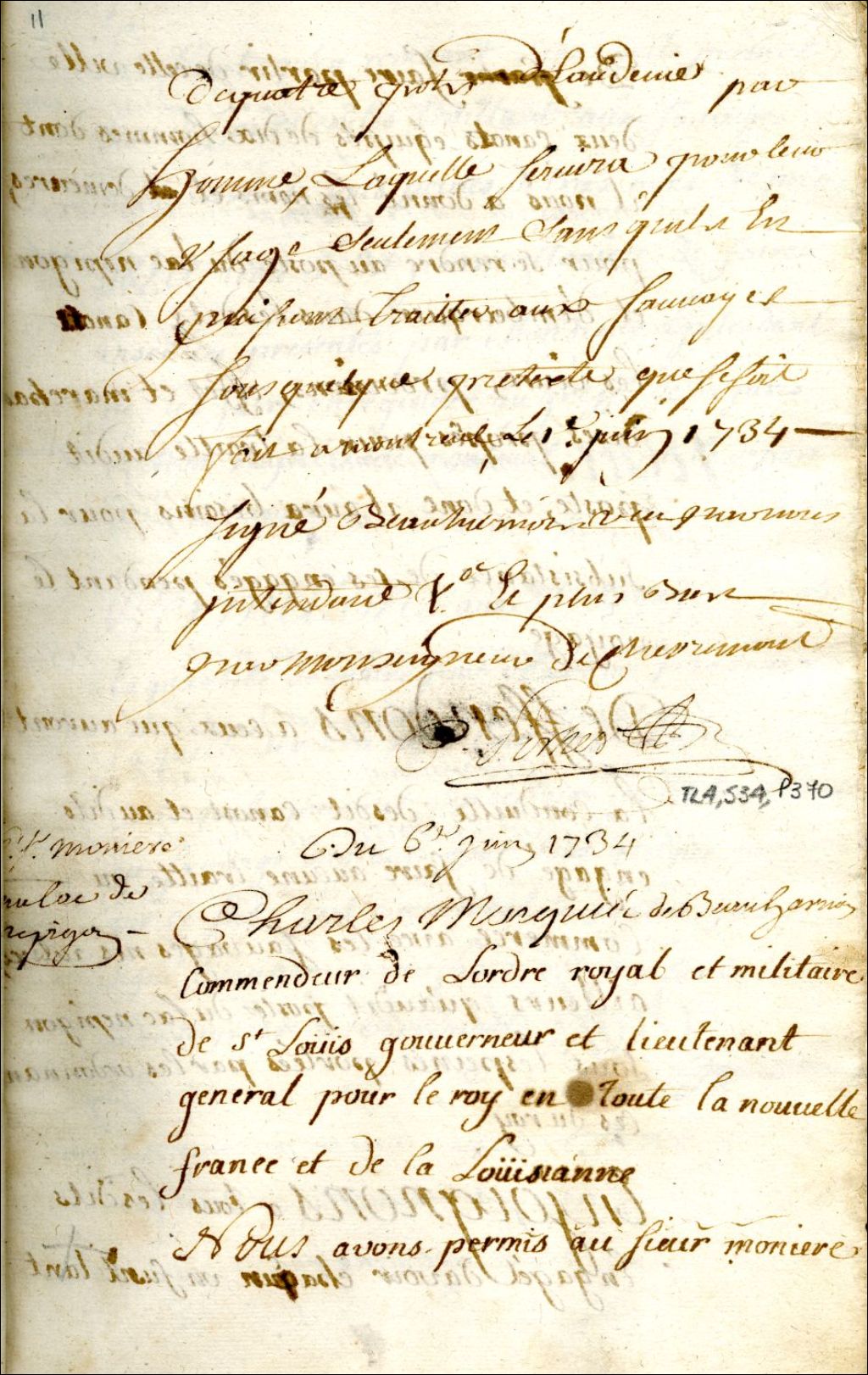 Montréal. Enregistrement d'une permission accordée par Charles de Beauharnois, gouverneur de la Nouvelle-France, le 4 juin, à Monière [Alexis Lemoine Monière], de deux canots et dix hommes, pour transporter les marchandises pour la traite au Poste du Lac Nepigon [Lake Nipigon, Ontario], 6 juin 1734, Archives nationales à Montréal, Fonds Juridiction royale de Montréal, (06M,TL4,S34,P370).