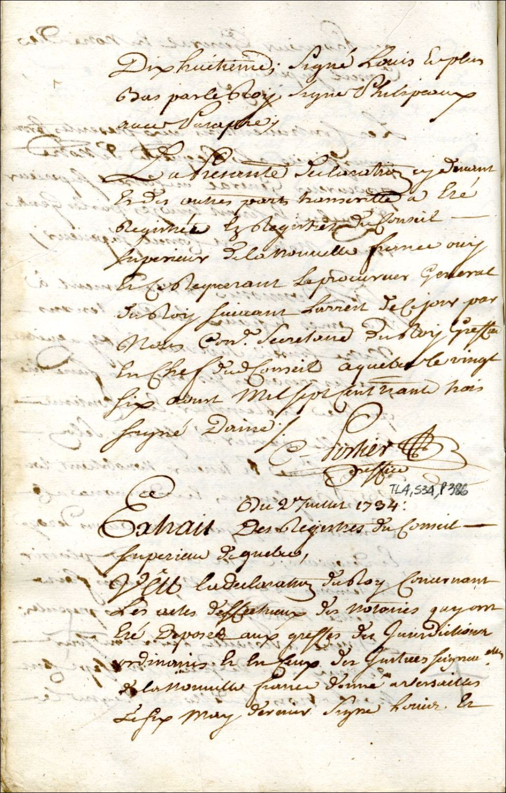Montréal. Enregistrement d'un extrait des registres du Conseil supérieur du 26 août 1733, de la déclaration royale du 6 mai 1733 concernant les actes défectueux rédigés par les notaires et déposés aux greffes des juridictions ordinaires et seigneuriales en Nouvelle-France