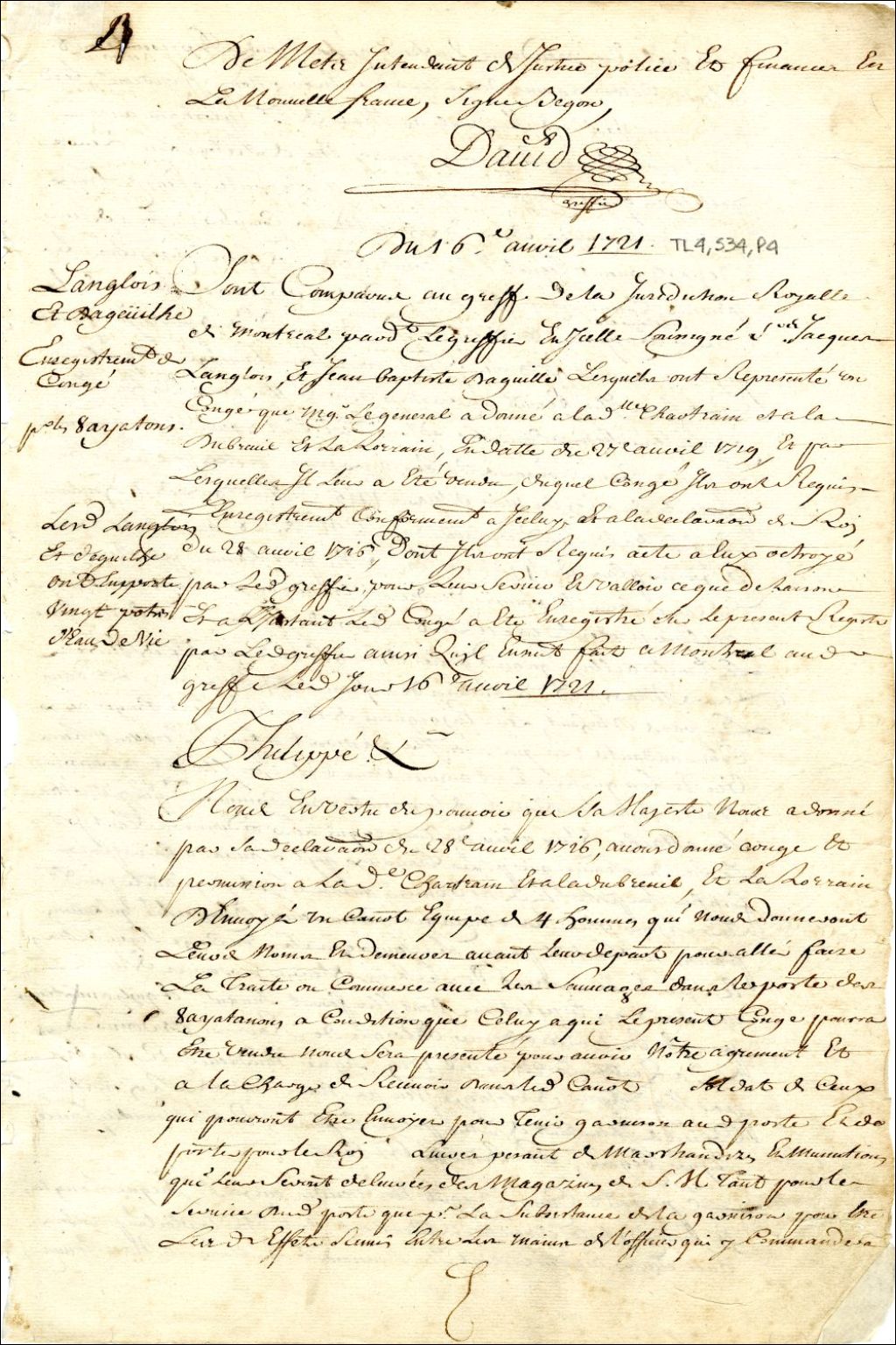 Montréal. Enregistrement d'un congé accordé par Philippe Rigaud de Vaudreuil gouverneur de la Nouvelle-France, le 31 août 1720, aux demoiselles et dames Chartrain, Dubreuil, Lorain, d'un canot et quatre hommes, pour porter marchandises et munitions au Poste des Ouyatanons et d'y amener un soldat pour la garnison en échange d'y faire la traite avec les Sauvages, 16 avril 1721, Archives nationales à Montréal, Fonds Juridiction royale de Montréal, (06M,TL4,S34,P4).