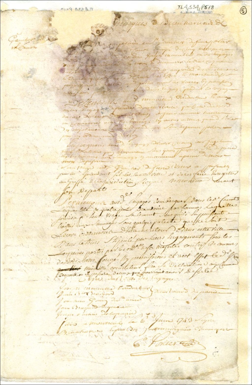 Montréal. Enregistrement d'une permission accordée par Charles de Beauharnois, gouverneur de la Nouvelle-France, le 6 juin, à [Michel Gamelin dit] Gaucher, d'un canot et cinq hommes, pour se rendre au Poste des Ouyatanons, 1743, Archives nationales à Montréal, Fonds Juridiction royale de Montréal, (06M,TL4,S34,P518).