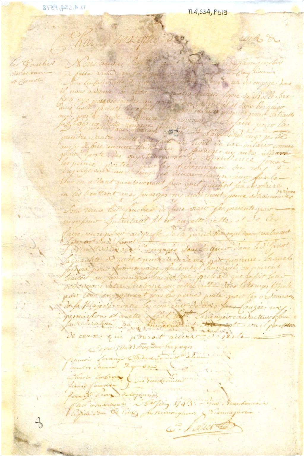 Montréal. Enregistrement d'une permission accordée par Charles de Beauharnois, gouverneur de la Nouvelle-France, le 6 juin, à [Michel Gamelin dit] Gaucher, d'un canot et cinq hommes, pour se rendre au Poste des Ouyatanons, 1743, Archives nationales à Montréal, Fonds Juridiction royale de Montréal, (06M,TL4,S34,P519).