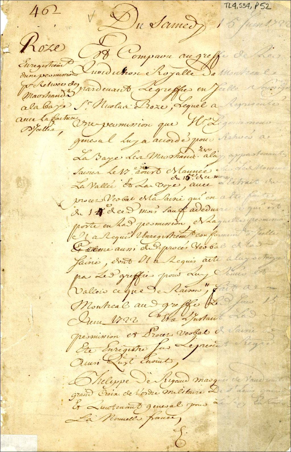 Montréal. Enregistrement d'une permission accordée par Philippe Rigaud de Vaudreuil gouverneur de la Nouvelle-France, à Nicolas Rose, de Michillimakinac, de nommer une personne pour recevoir à la Baye [Baie des Puants, Green Bay, Wisconsin], les marchandises lui appartenant et saisies le 17 août 1721 sur les nommés Lavallée et Lavoie, 15 juin 1722, Archives nationales à Montréal, Fonds Juridiction royale de Montréal, (06M,TL4,S34,P52).