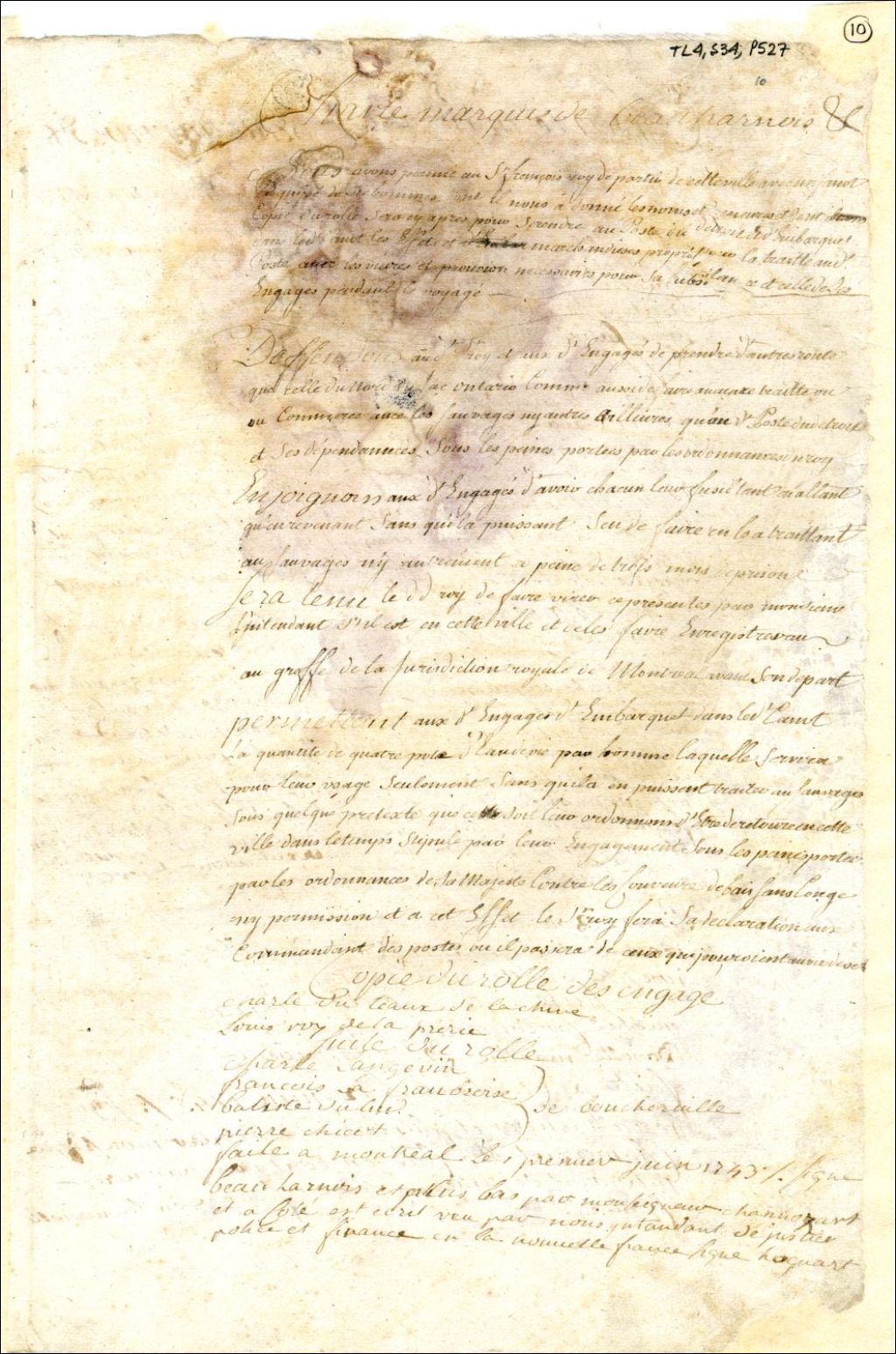 Montréal. Enregistrement d'une permission accordée par Charles de Beauharnois, gouverneur de la Nouvelle-France, le 1er juin, à François Roy, d'un canot et six hommes, pour se rendre au Poste de Détroit, 1743, Archives nationales à Montréal, Fonds Juridiction royale de Montréal, (06M,TL4,S34,P527).