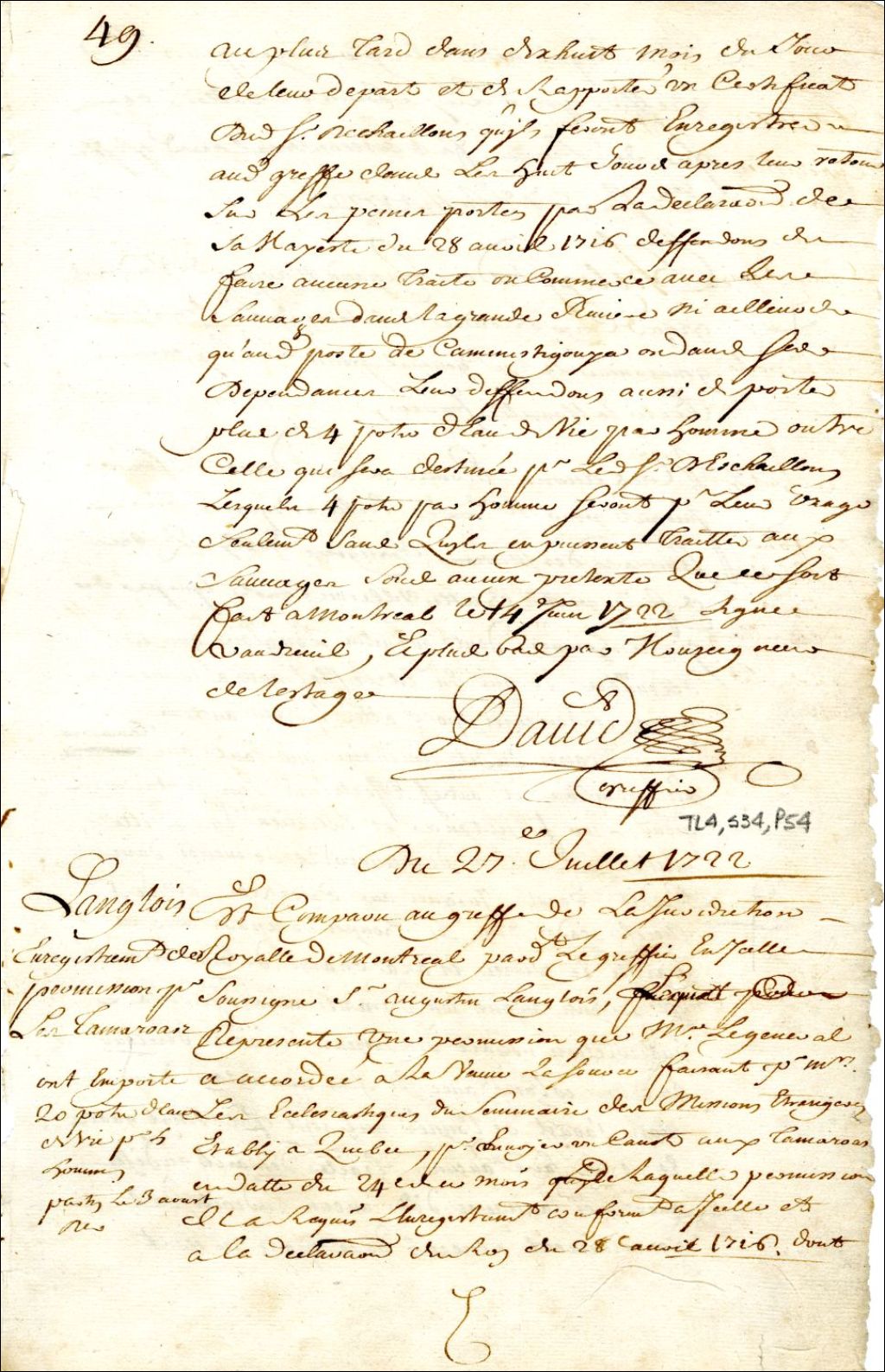 - Montréal. Enregistrement d'une permission accordée par Philippe Rigaud de Vaudreuil gouverneur de la Nouvelle-France, le 24 juillet à madame Lasource pour le séminaire des Missions étrangères de Québec, d'un canot et quatre hommes, lui compris, pour porter des provisions aux missionnaires aux Tamaroas