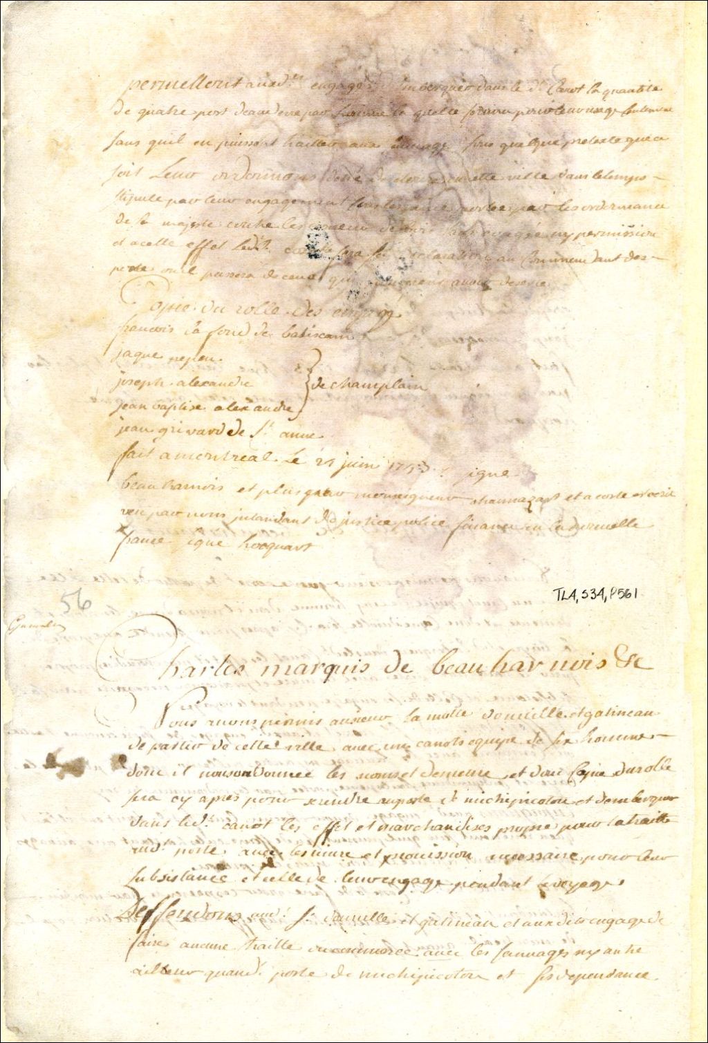 Montréal. Enregistrement d'une permission accordée par Charles de Beauharnois, gouverneur de la Nouvelle-France, le 25 juin, à Lamothe Douville et Gatineau, d'un canot et six hommes, pour se rendre au Poste de Michipicoton [près de Michipicoton Harbour, On], 1743, Archives nationales à Montréal, Fonds Juridiction royale de Montréal, (06M,TL4,S34,P561).