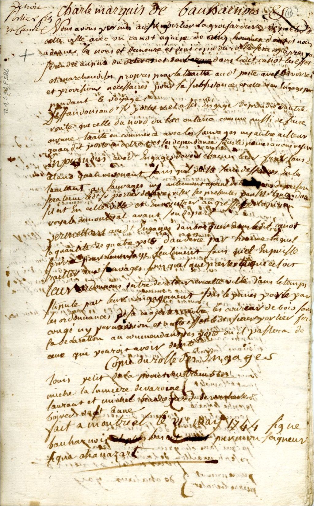 Montréal. Enregistrement d'une permission accordée par Charles de Beauharnois, gouverneur de la Nouvelle-France, le 21 mai, à Porlier Lagrossardière, fils, d'un canot et cinq hommes, pour aller au Poste de Détroit, 1744, Archives nationales à Montréal, Fonds Juridiction royale de Montréal, (06M,TL4,S34,P586).