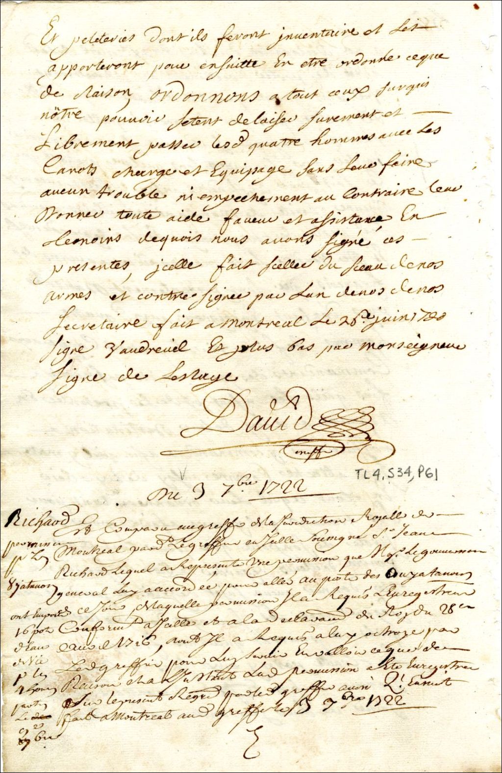 Montréal. Enregistrement d'une permission accordée par Philippe Rigaud de Vaudreuil gouverneur de la Nouvelle-France, à Jean Richard, ci-devant interprète et forgeron, d'un canot et quatre hommes, pour ramener sa femme [Marie-Anne You], et leurs trois enfants au poste des Ouyatanons, dont elle est originaire, 3 septembre 1722, Archives nationales à Montréal, Fonds Juridiction royale de Montréal, (06M,TL4,S34,P61).
