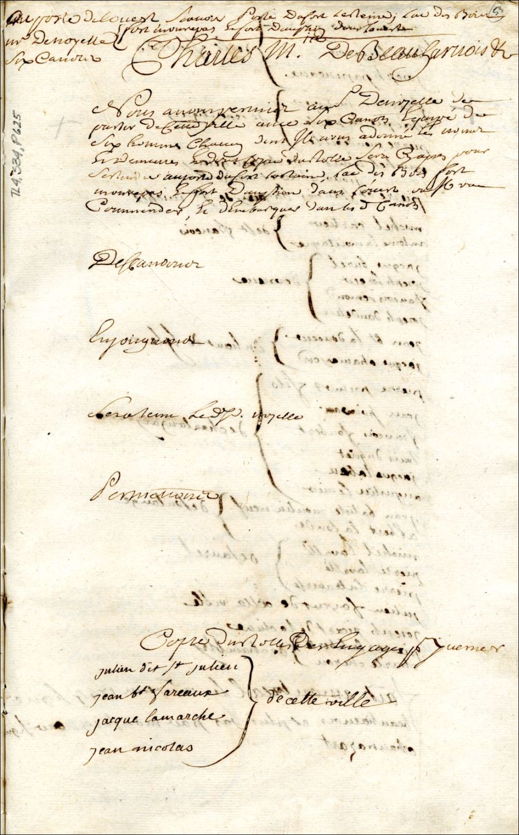 - Les engagés hivernants sont Julien dit St-Julien, Jean-Baptiste Favraux, Jacques Lamarche et Jean Nicolas, de Montréal; Pierre Duverger, Louis Bergeron, Joseph Papineau, de St-François; François Metivier, Jacques Laporte et Pierre Mandeville, de Repentigny; Michel Lemire (?), de Châteauguay. Les engagés pour faire l'aller-retour sont Pierre et François Bag..., de St-Michel; Michel Cartier et Antoine Lamontagne, de St-François; Jacques Burel, Joseph Berger, François Remond [Raymond] et Joseph Daudelin, de Varennes; Jean-Baptiste Ladouceur et Jacques Chamayard, du Haut-de-l'Île; Pierre Primot, fils, Jean Poissan (?), François Foubert, Louis Duguet [Duguay], Jacques Tabau et Augustin Lemire, de Châteauguay; Jean-Baptiste Moulineuf et Albert Lalonde, de Soulanges; Michel Lavallée, Pierre Lavallée et Pierre Latraverse, de Saurel; Julien Forand, de Montréal; Joseph Picard, de Lachine; Pierre Laliberté et Charles Cheroux, de Chambly