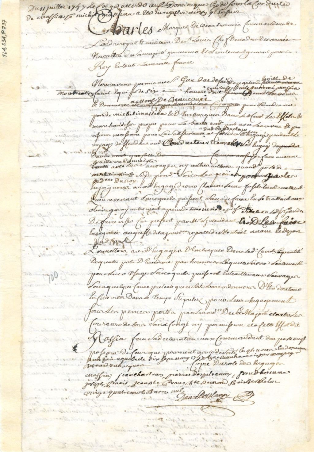 Montréal. Enregistrement d'une permission accordée par Charles de Beauharnois, gouverneur de la Nouvelle-France, le 17 mai, à Dominique Godé, d'un canot et six hommes, pour se rendre au Poste de Michillimakinac, 11 juillet 1747, Archives nationales à Montréal, Fonds Juridiction royale de Montréal, (06M,TL4,S34,P737).