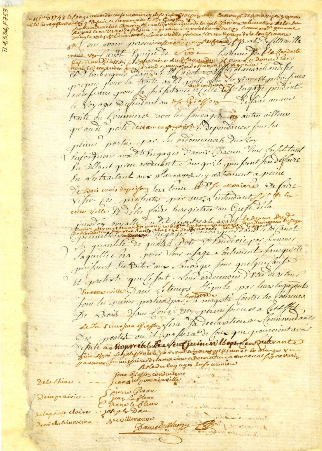 Montréal. Enregistrement d'une permission accordée par Roland-Michel Barrin de La Galissonière, commandant général de la Nouvelle-France, le 9 juin, à [Alexis Lemoine] Monière, négociant, pour Jean Giasson, d'un canot et six hommes, pour se rendre au Poste de Kamanistigouya [Kaministiquia (Thunder Bay, Ontario)], 11 juin 1748, Archives nationales à Montréal, Fonds Juridiction royale de Montréal, (06M,TL4,S34,P753).