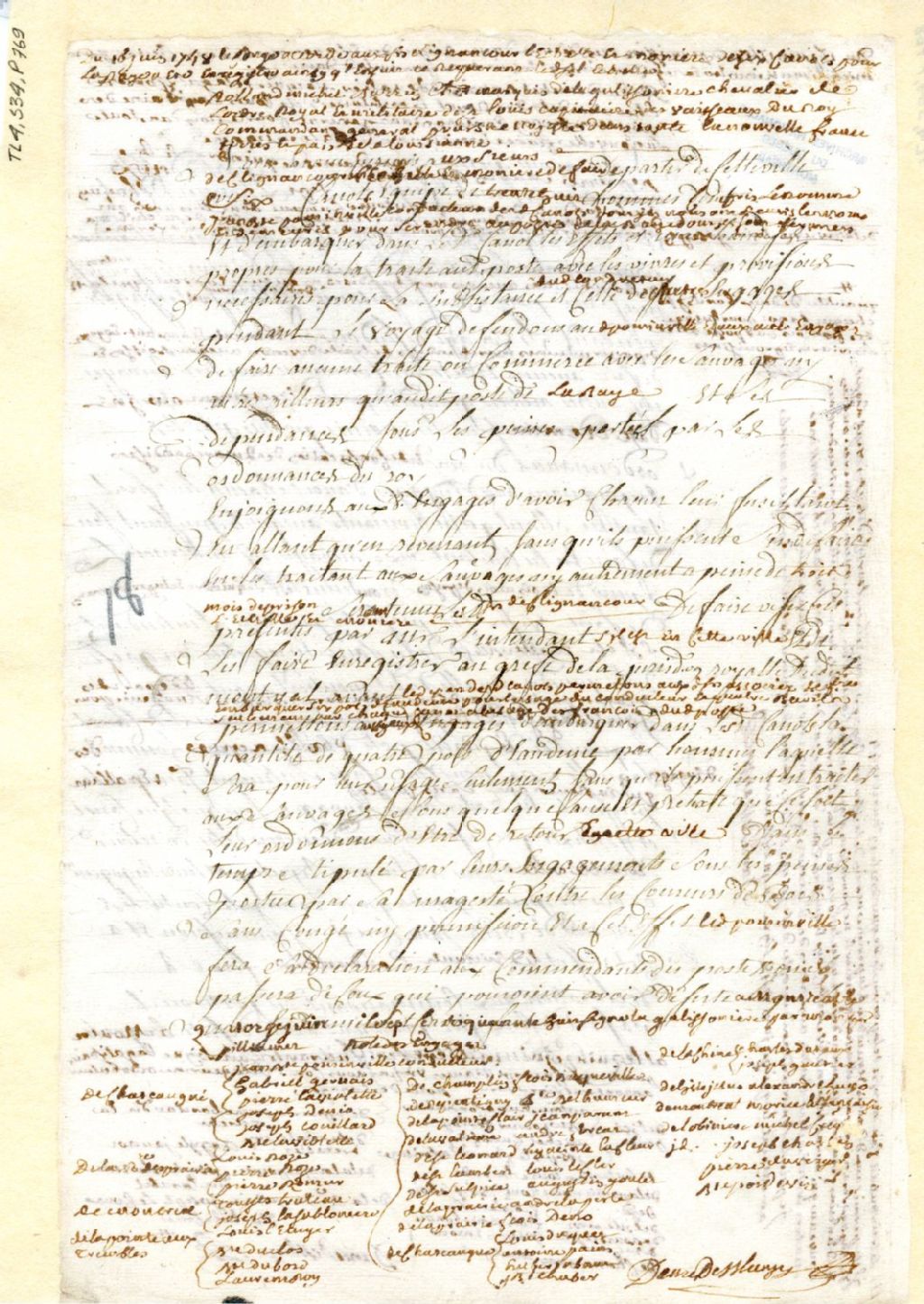Montréal. Enregistrement d'une permission accordée par Roland-Michel Barrin de La Galissonière, commandant général de la Nouvelle-France, le 14 juin, à [Louis-Mathieu Damours] De Clignancourt, [Jean] L'Echelle et [Alexis Lemoine] Monière, de six canots et trente-huit hommes, pour se rendre au Poste de la Baye [Baie-des-Puants (Green Bay, Wisc.)], 16 juin 1748, Archives nationales à Montréal, Fonds Juridiction royale de Montréal, (06M,TL4,S34,P769).