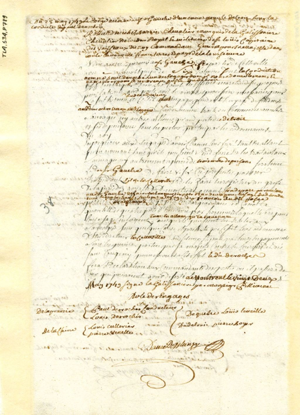 Montréal. Enregistrement d'une permission accordée par Roland-Michel Barrin de La Galissonière, commandant général de la Nouvelle-France, le 22 mai, à [Michel Gamelin dit] Gaucher, négociant, d'un canot et six hommes, pour se rendre au Poste de Détroit, 28 mai 1749, Archives nationales à Montréal, Fonds Juridiction royale de Montréal, (06M,TL4,S34,P789).
