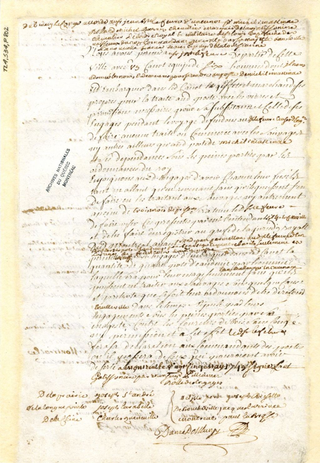 Montréal. Enregistrement d'une permission accordée par Roland-Michel Barrin de La Galissonière, commandant général de la Nouvelle-France, le 25 mai, à Jean-Baptiste Lefebvre, d'un canot et six hommes, pour se rendre au Poste de Michillimakinac, 6 juin 1749, Archives nationales à Montréal, Fonds Juridiction royale de Montréal, (06M,TL4,S34,P802).