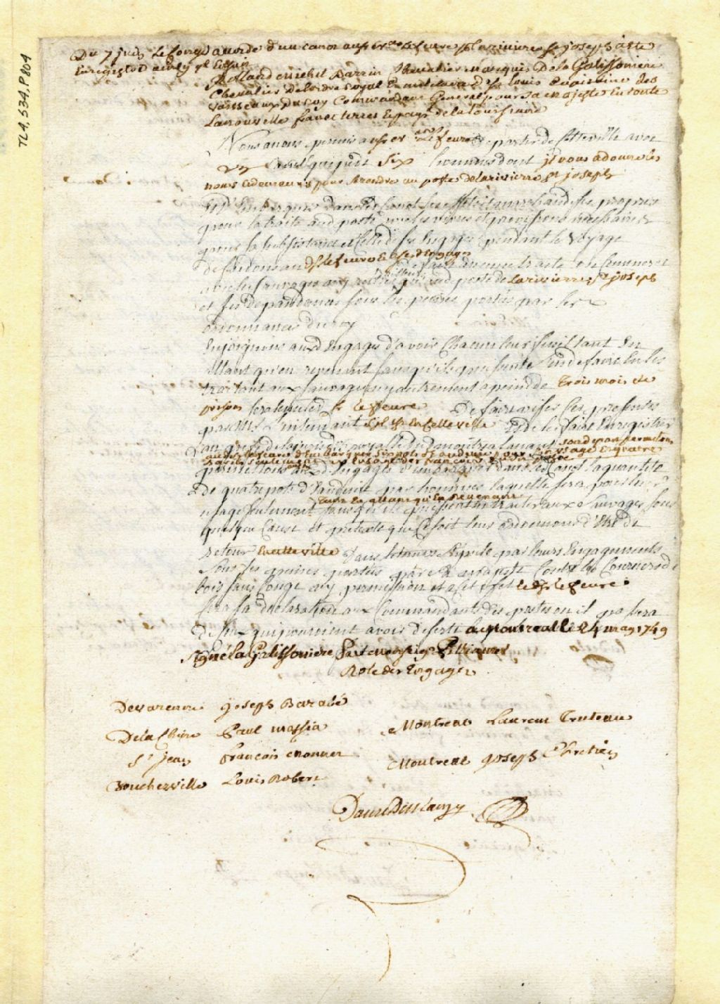 Montréal. Enregistrement d'une permission accordée par Roland-Michel Barrin de La Galissonière, commandant général de la Nouvelle-France, le 24 mai, à Lefebvre, d'un canot et six hommes, pour se rendre au Poste de la Rivière St-Joseph, 7 juin 1749, Archives nationales à Montréal, Fonds Juridiction royale de Montréal, (06M,TL4,S34,P804).
