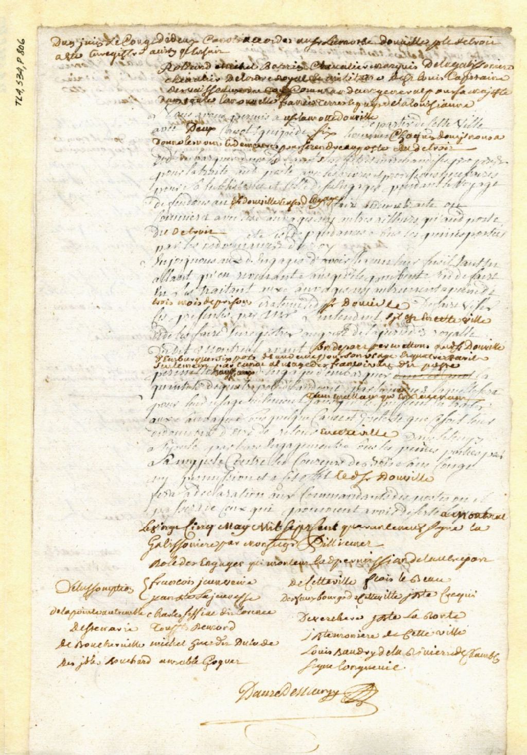 Montréal. Enregistrement d'une permission accordée par Roland-Michel Barrin de La Galissonière, commandant général de la Nouvelle-France, le 25 mai, à Lamothe Douville, de deux canots et douze hommes, pour se rendre au Poste de Détroit., 9 juin 1749, Archives nationales à Montréal, Fonds Juridiction royale de Montréal, (06M,TL4,S34,P806).