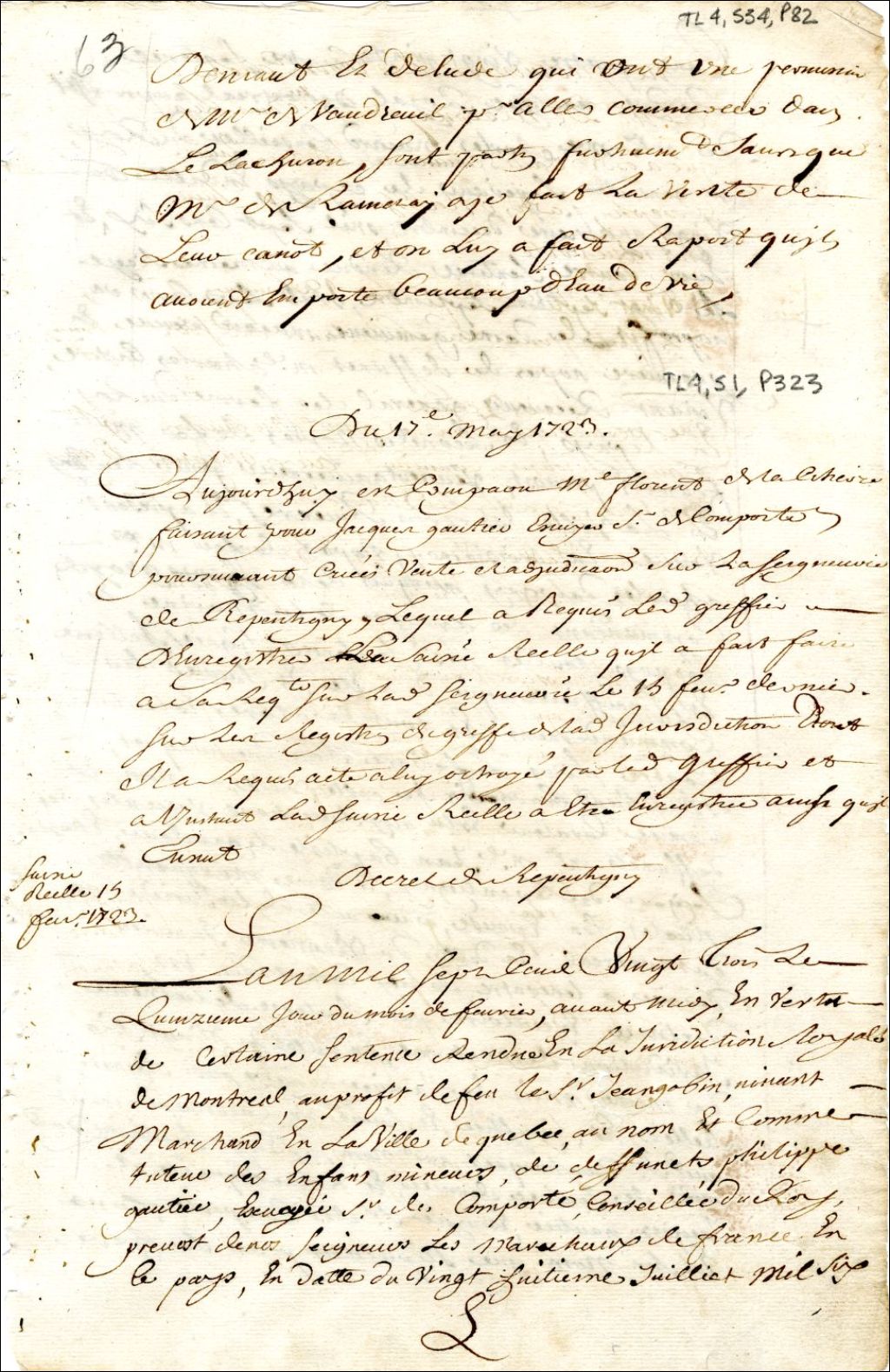 Montréal. Enregistrement d'une permission à la demande de Claude de Ramezay, gouverneur de Montréal, et accordée à Deniau et Dulude, d'un canot, pour aller commercer dans le lac Huron. Sont partis furtivement sans que M. De Ramezay puisse faire la visite de leur canot