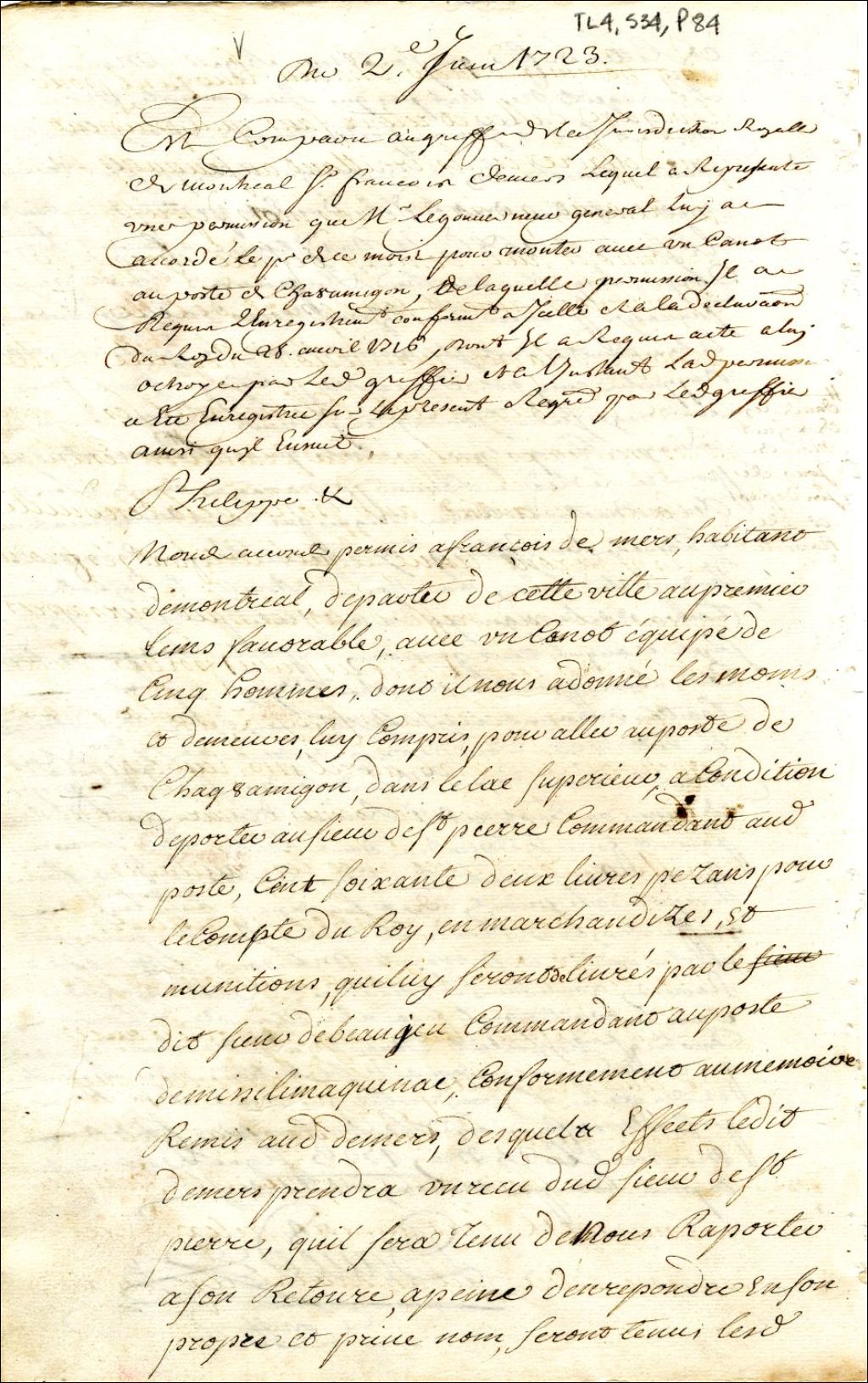 Montréal. Enregistrement d'une permission accordée par Philippe Rigaud de Vaudreuil gouverneur de la Nouvelle-France, le 1er juin, à François Demers, d'un canot et cinq hommes, lui compris, pour faire la traite au poste de Chagouamigon, 2 juin 1723, Archives nationales à Montréal, Fonds Juridiction royale de Montréal, (06M,TL4,S34,P84).