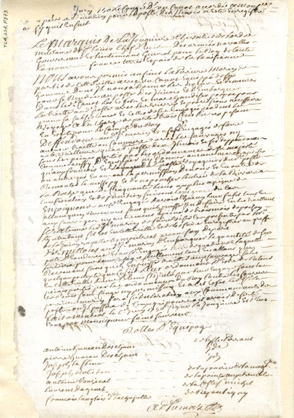 Montréal. Enregistrement d'une permission accordée par Jacques-Pierre Taffanel de la Jonquière, gouverneur de la Nouvelle-France, le 6 juin, à Laperrière Marin, d'un canot et six hommes, pour se rendre au Poste des Illinois, Juin 1750, Archives nationales à Montréal, Fonds Juridiction royale de Montréal, (06M,TL4,S34,P873).