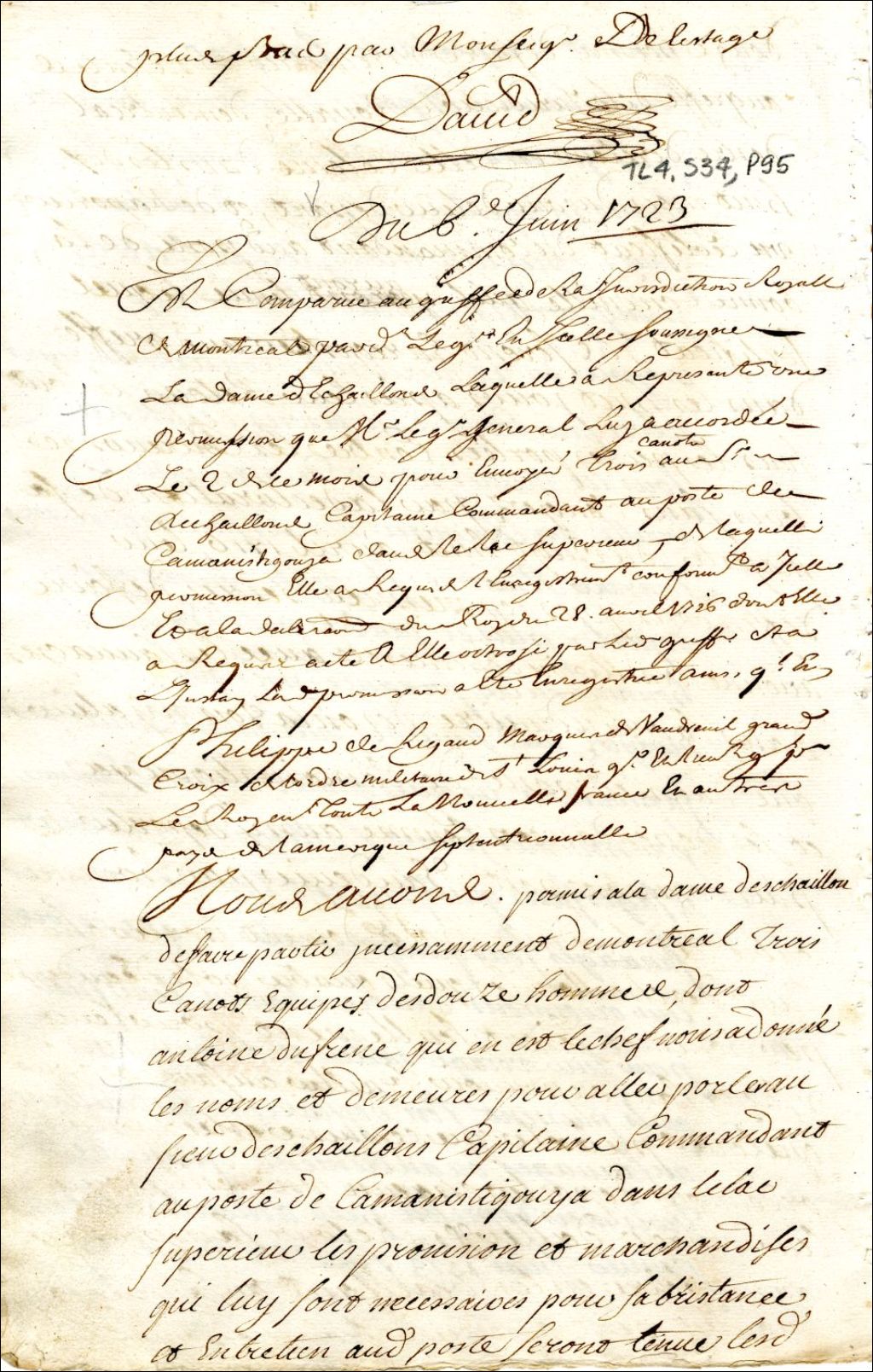 Montréal. Enregistrement d'une permission accordée par Philippe Rigaud de Vaudreuil gouverneur de la Nouvelle-France, le 2 juin, à la dame Deschaillons [Marguerite Legardeur], de trois canots et douze hommes, dont Antoine Dufrene [Dufresne] sera le chef, pour porter des marchandises et provisions au capitaine [Jean-Baptiste de Saint-Ours] Deschaillons, commandant au Poste de Camanistigouya au Lac Supérieur [Kaministiquia (Thunder Bay, Ontario)], 6 juin 1723, Archives nationales à Montréal, Fonds Juridiction royale de Montréal, (06M,TL4,S34,P95).