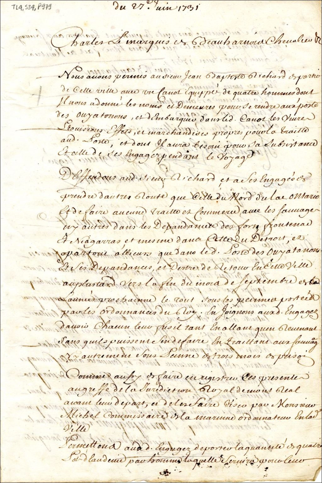 Montréal. Enregistrement d'une permission accordée par Charles de Beauharnois, gouverneur de la Nouvelle-France, le 15 juin, à Jean-Baptiste Richard, d'un canot et quatre hommes, pour se rendre au Poste des Ouyatanons, 27 juin 1731, Archives nationales à Montréal, Fonds Juridiction royale de Montréal, (06M,TL4,S34,P979).