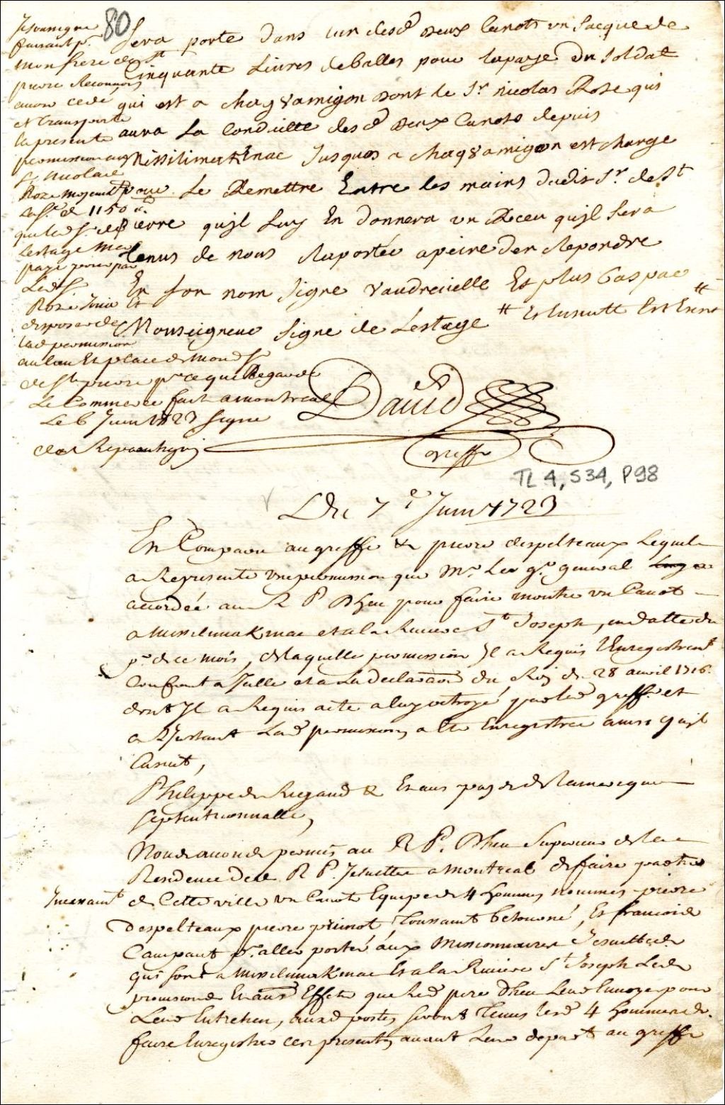 Montréal. Enregistrement d'une permission accordée par Philippe Rigaud de Vaudreuil gouverneur de la Nouvelle-France, le 1er juin, au révérend père Dheu [Jacques d'Heu], supérieur de la résidence des jésuites à Montréal, d'un canot et quatre hommes, lui compris, pour porter aux missionnaires de Michillimakinac et de la Rivière St-Joseph, des provisions, 7 juin 1723, Archives nationales à Montréal, Fonds Juridiction royale de Montréal, (06M,TL4,S34,P98).