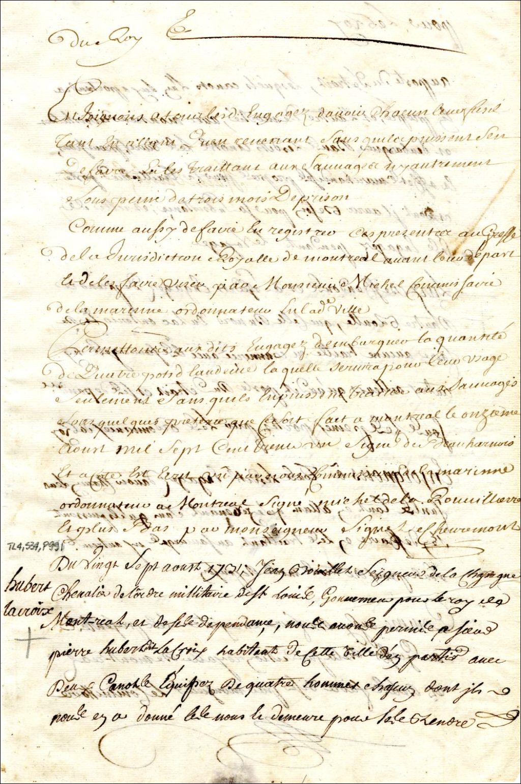 Montréal. Enregistrement d'une permission accordée par Jean Bouillet de la Chassaigne, gouverneur de Montréal, le 25 août, à Pierre Hubert dit Lacroix, de deux canots et huit hommes, pour se rendre au Poste de Détroit, 27 août 1731, Archives nationales à Montréal, Fonds Juridiction royale de Montréal, (06M,TL4,S34,P991).
