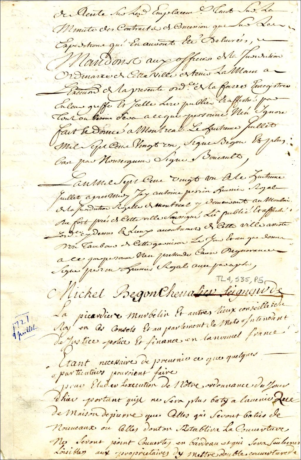 Montréal. Enregistrement de l'ordonnance de Michel Bégon, intendant de la Nouvelle-France, au sujet du procès-verbal à faire des maisons, de leurs propriétaires et de leur alignement à Montréal suite à l'incendie du 19 juin 1721, 9 juillet 1721, Archives nationales à Montréal, Fonds Juridiction royale de Montréal, (06M,TL4,S35,P5).