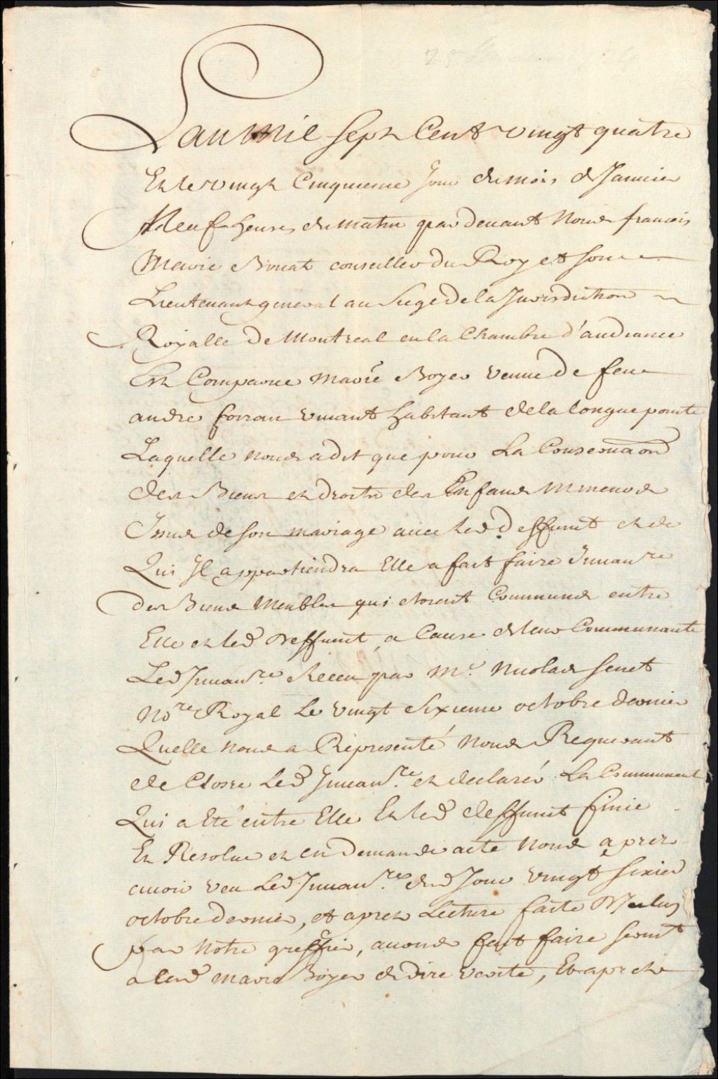 Clôture d'inventaire des biens de la succession et de la communauté de Marie Boyer, veuve d'André Forand, 25 janvier 1724, Archives nationales à Montréal, Clôtures d'inventaires. District judiciaire de Montréal, (06M,CV601,S1,D105).