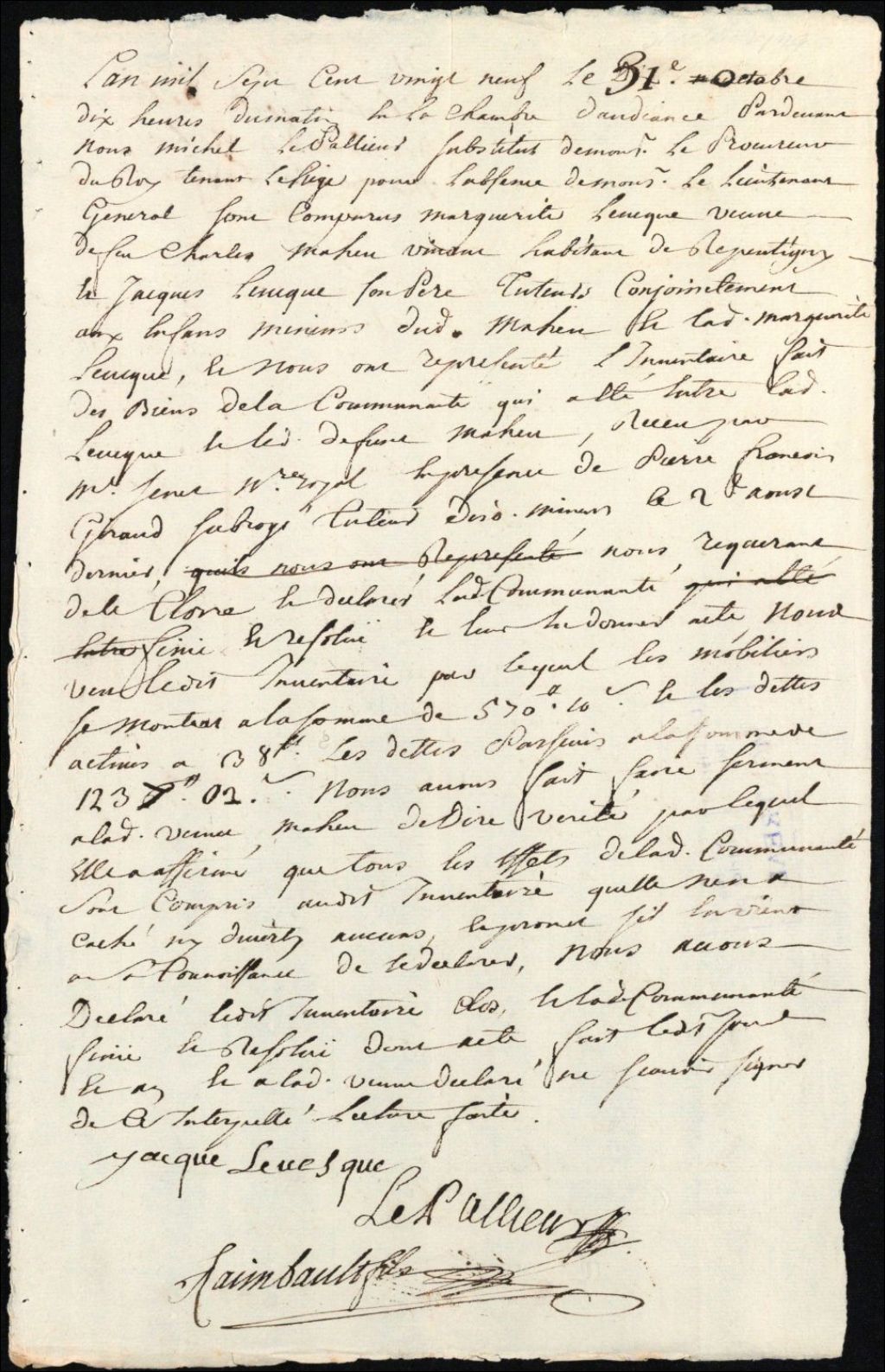 Clôture d'inventaire des biens de la succession et de la communauté de Marguerite Lévesque et de défunt Charles Maheu